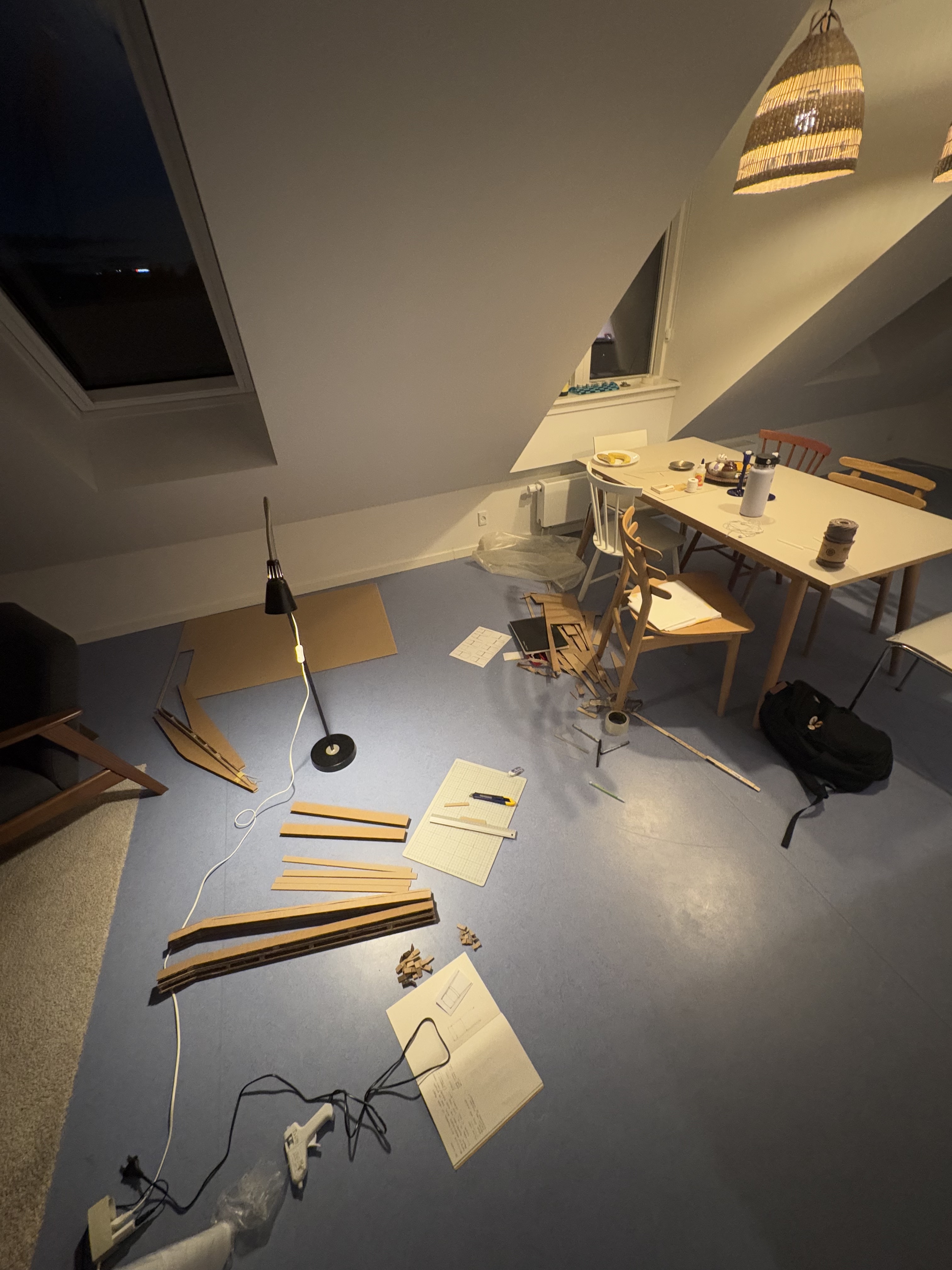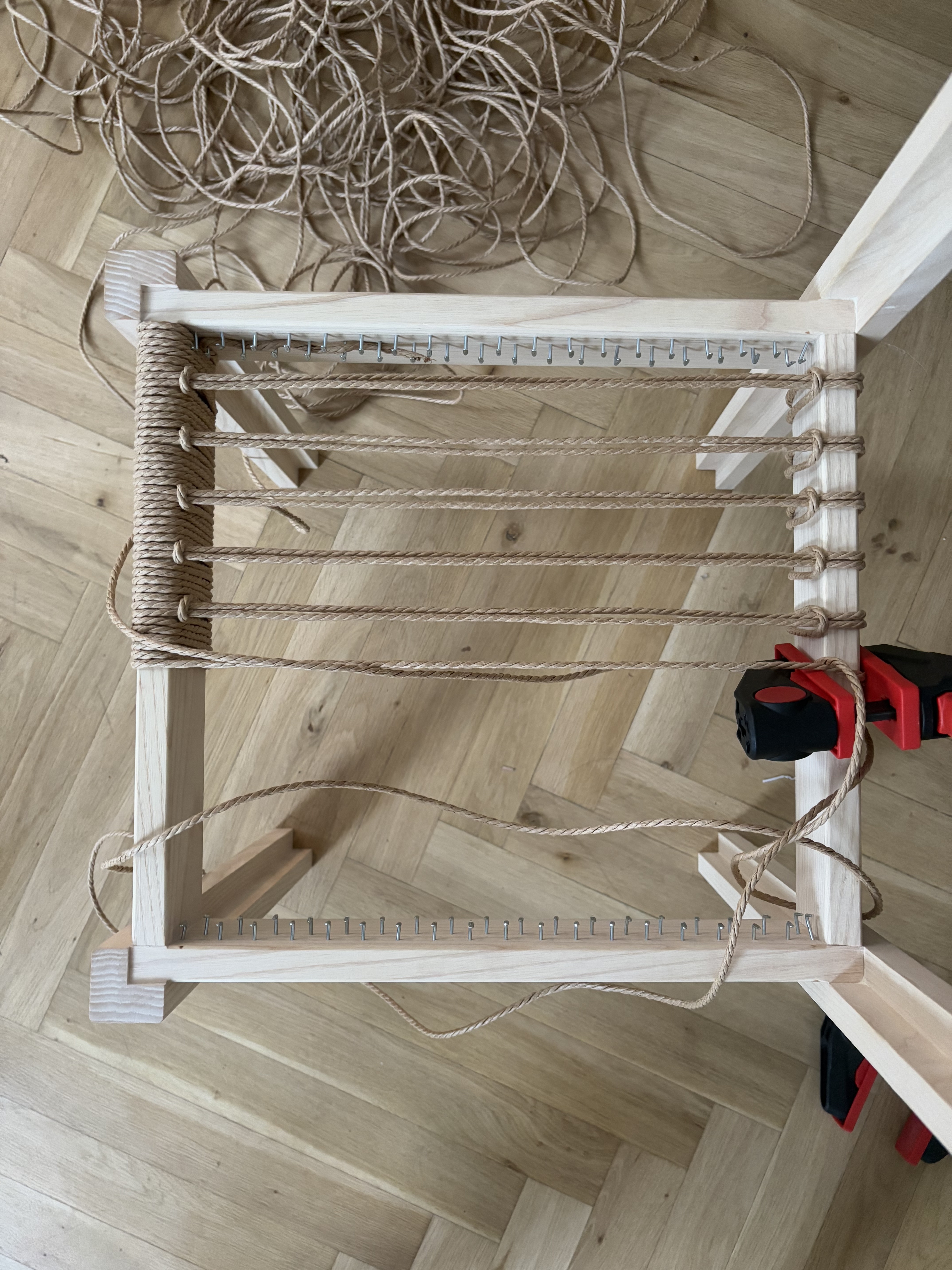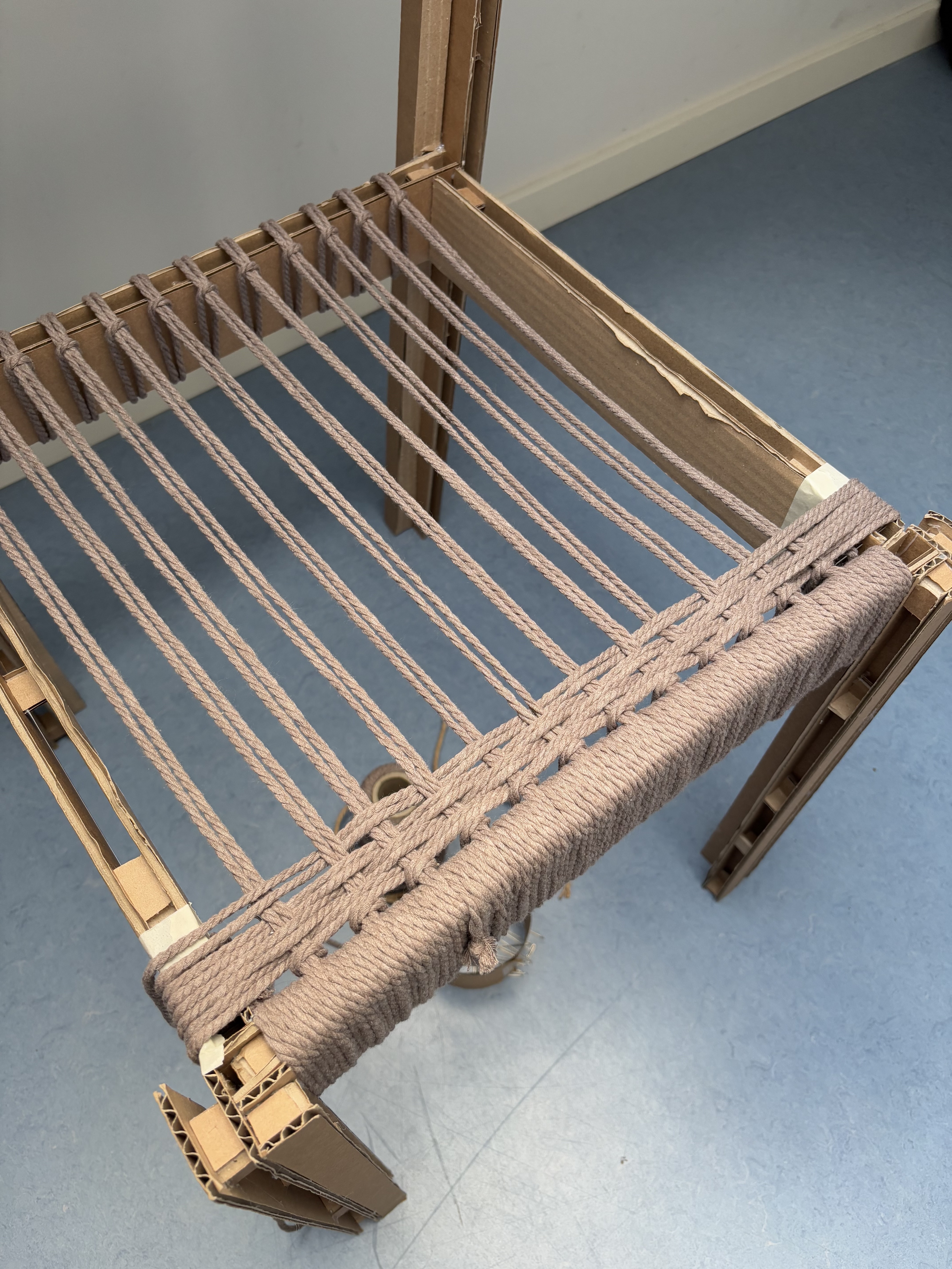 1:10 scale model. 1:1 scale cardboard model built in my flat's dining room. Practiced weaving on the cardboard model with thicker string and pins acting as the L nails used on the wood later.