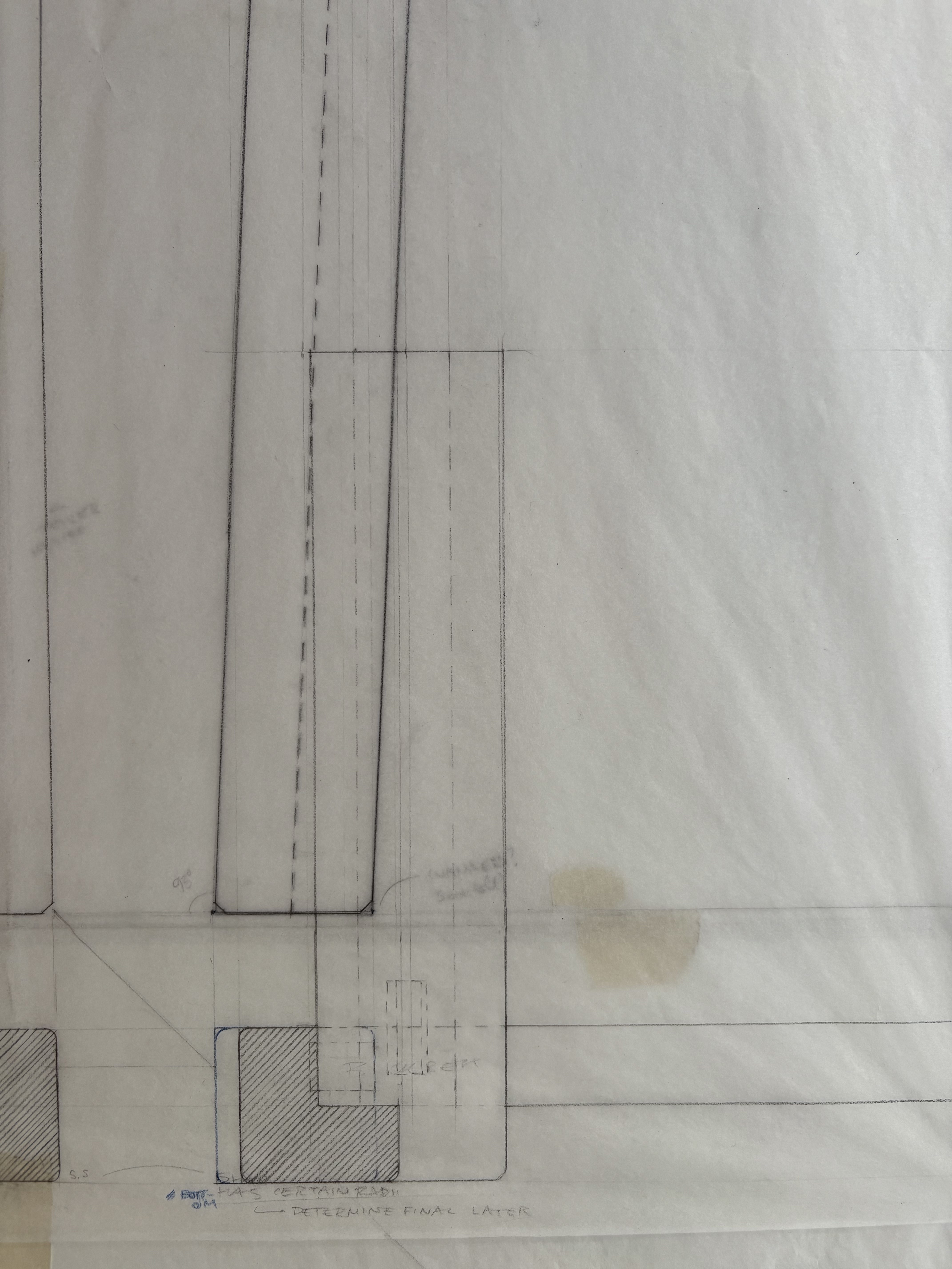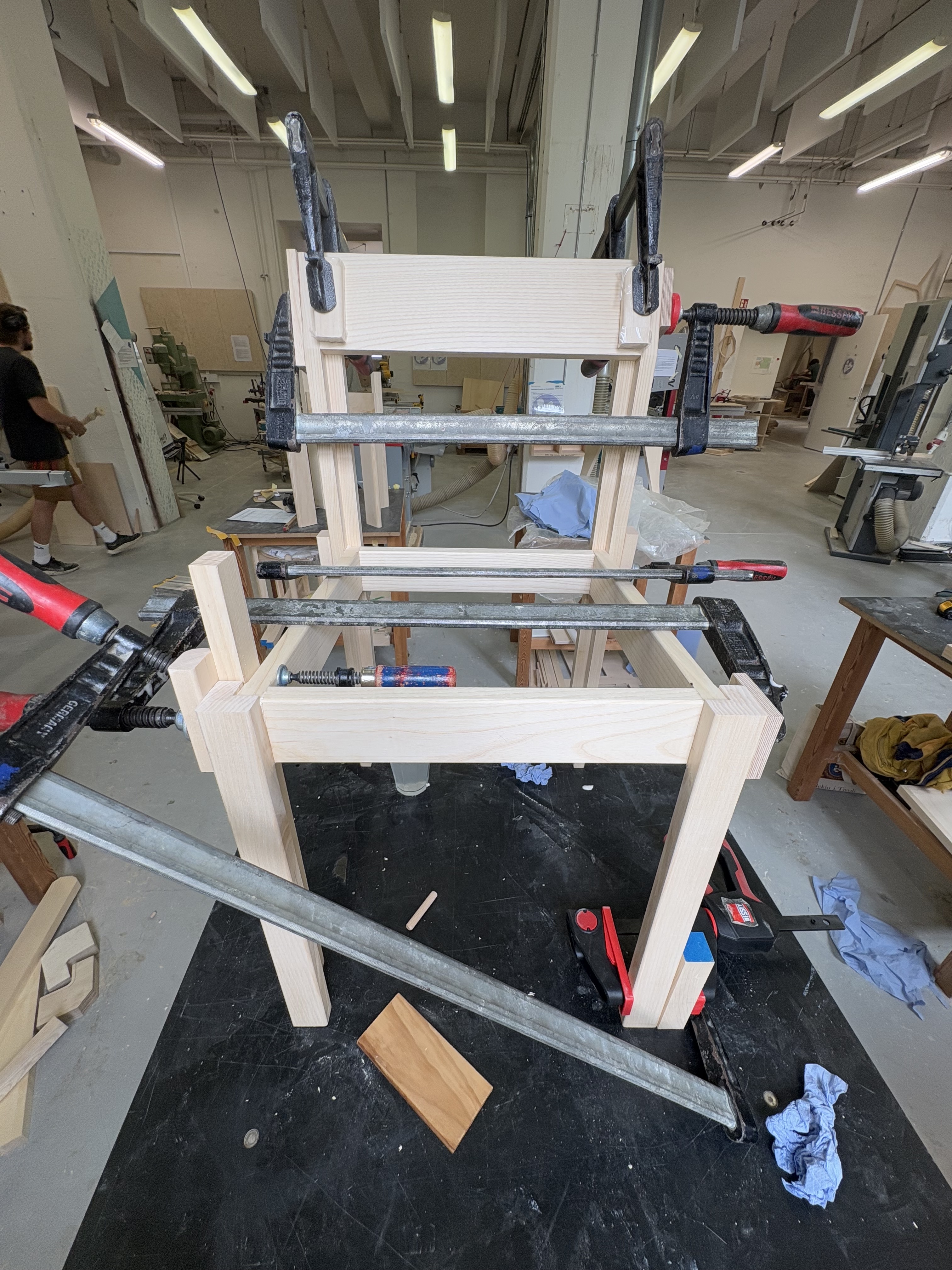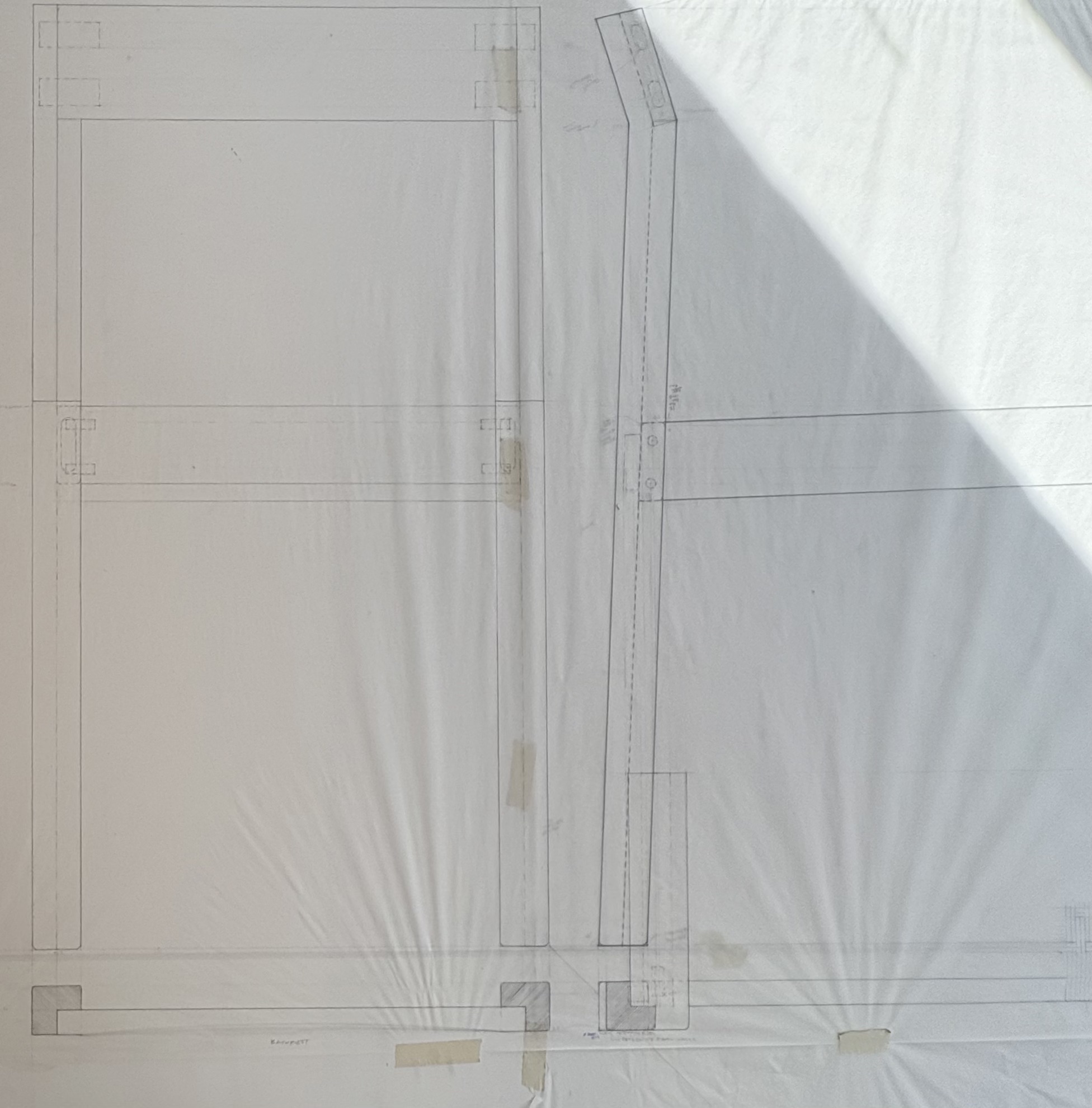 Front, side, and top view. Shows end grain, joinery methods (domino, dowels, mortise and tenon was later decided to be a domino joint as well), and angles.