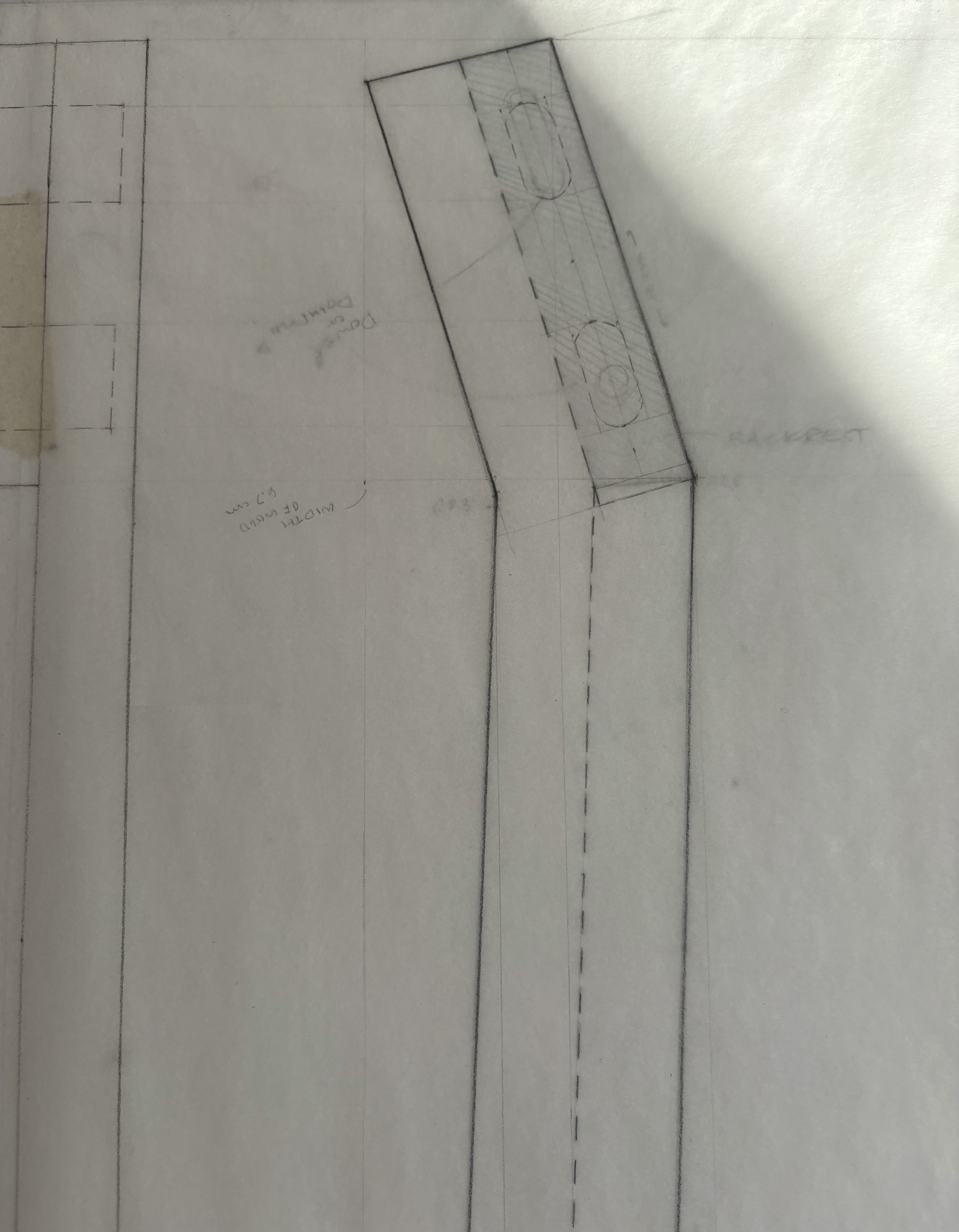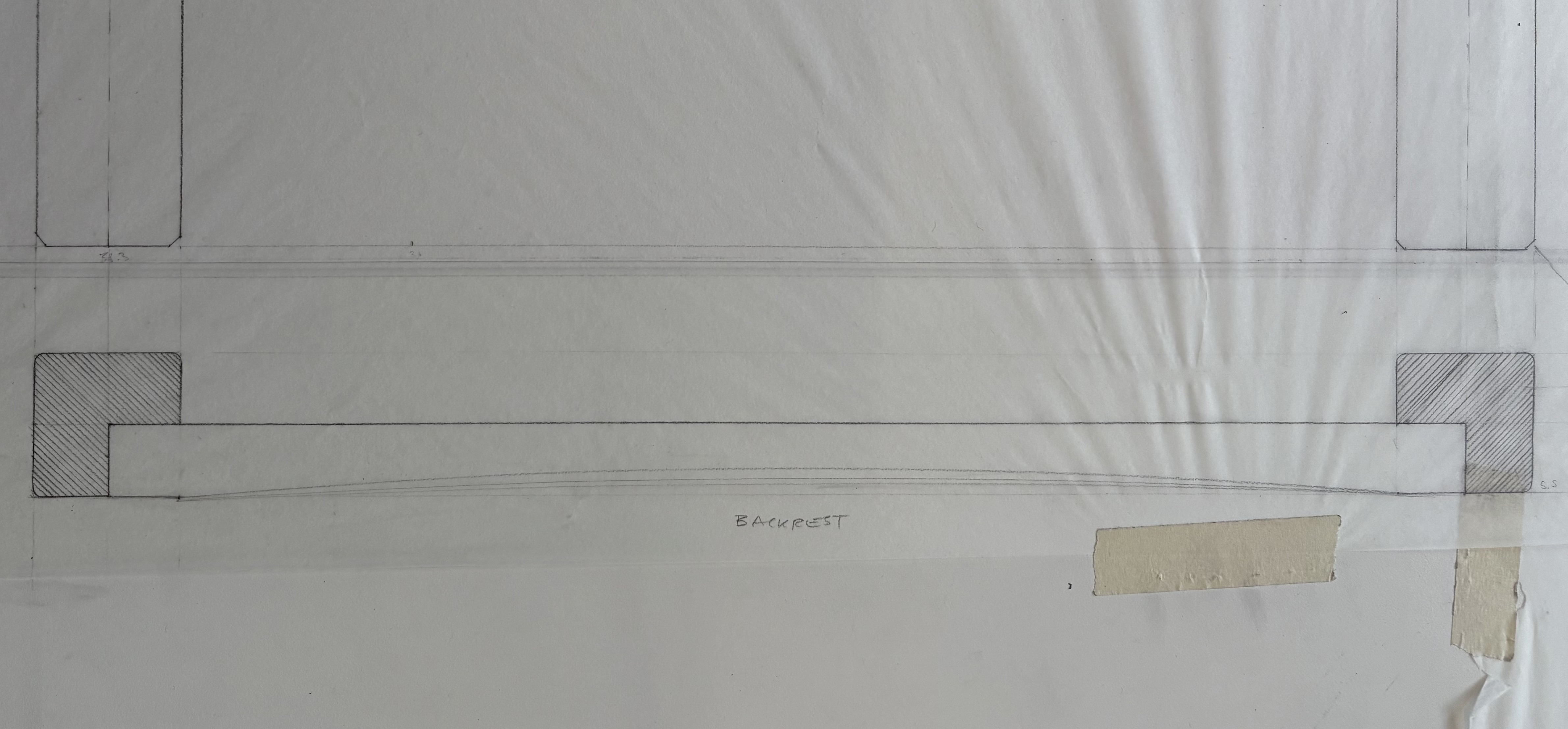 Back legs made from solid pieces of wood. The shape was made with the band saw, jointer, router, and belt sander. 90º cut in the legs made from several 1/8" passes across the router. Backrest should have had a slight curve cut into it; forgotten in the rush of finishing.