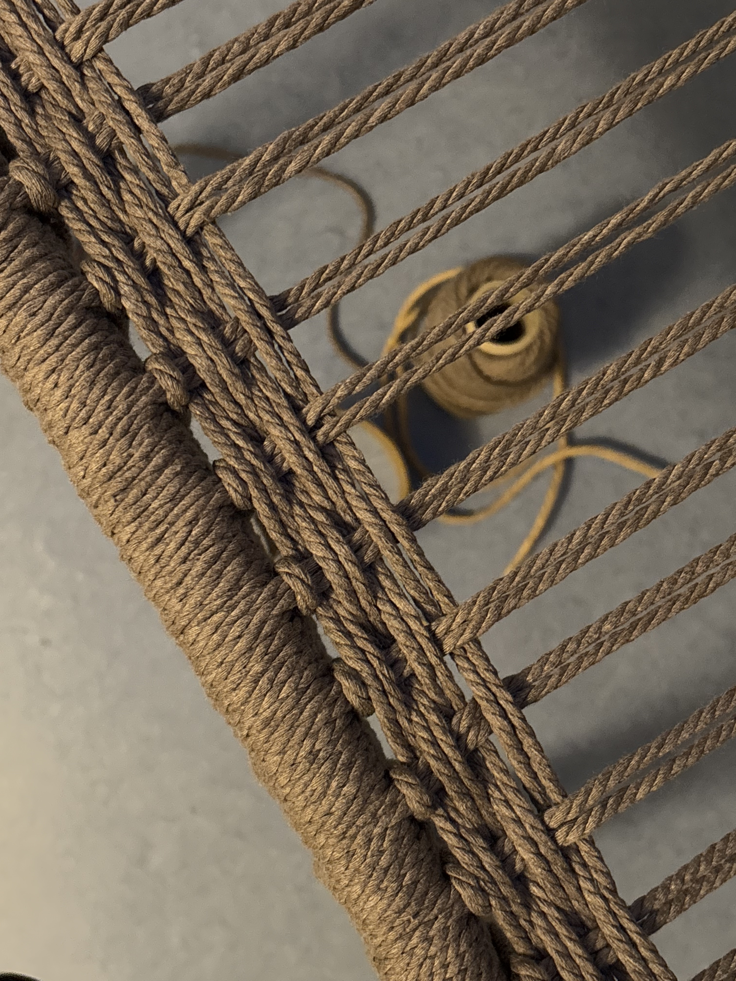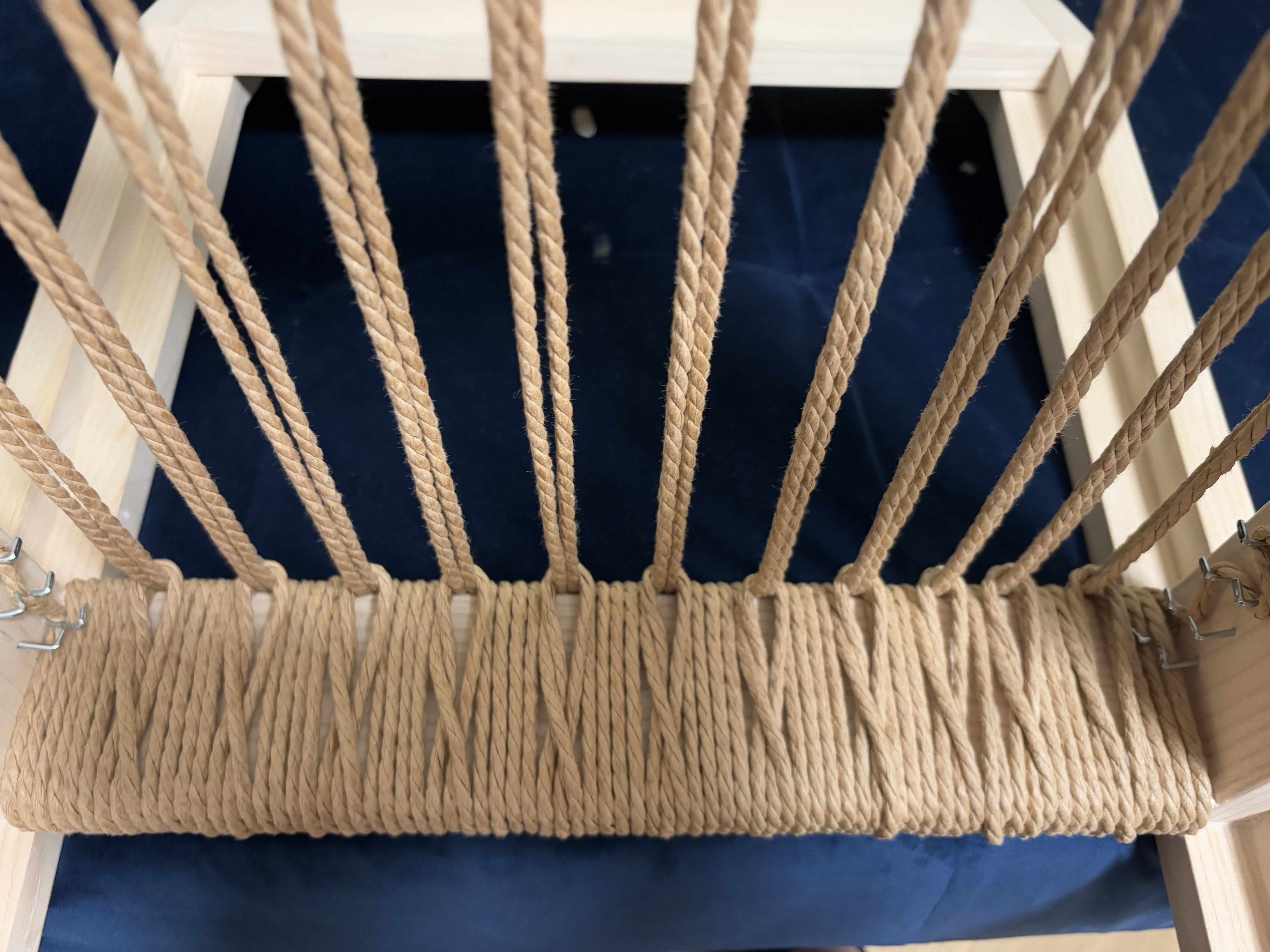 Warp threads (front to back) used knots instead of L nails to secure the paper cord to the seat frame. I wove one continuous cord. Weft threads (side to side) used L nails to easily weave across the seat without having to pull the entire length of cord through each pass.