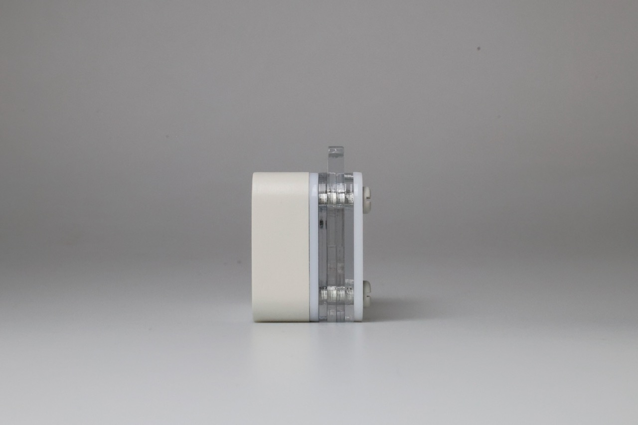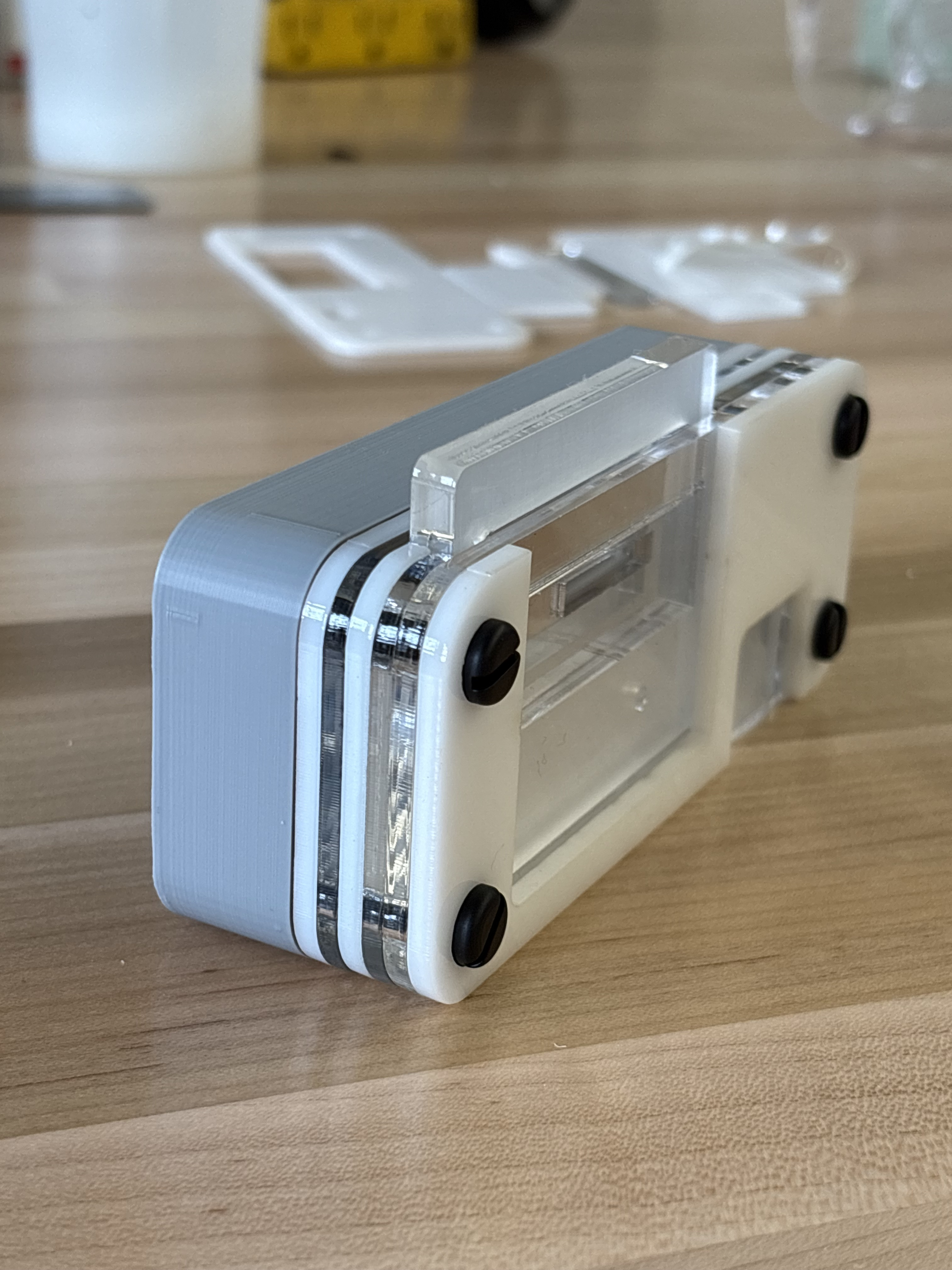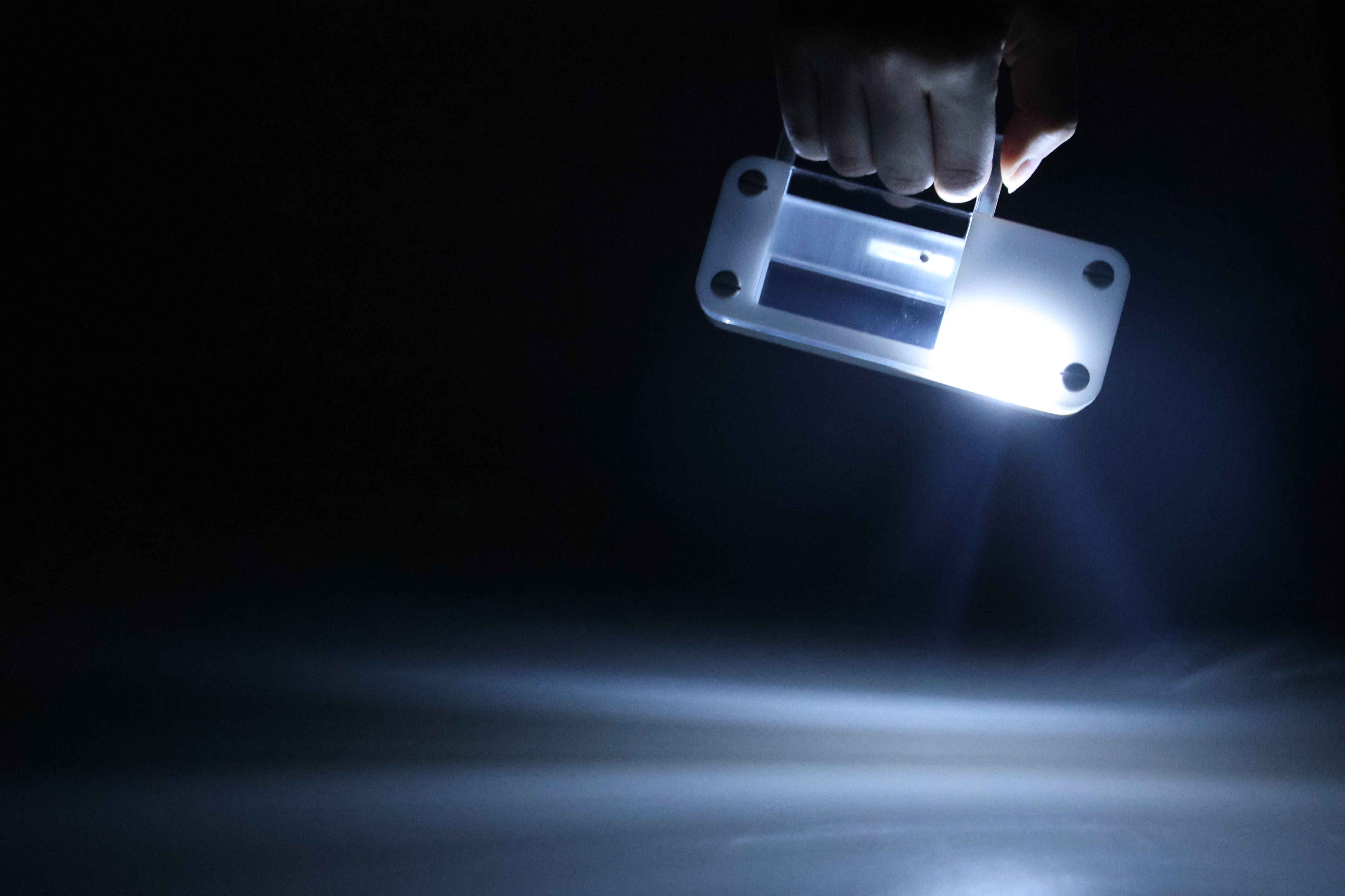 A total of six ⅛” layers of acrylic were used on top of the 3D printed base. Cuts were often re-evaluated for tighter fits for the circuitry, space for the handle to move smoothly, and an accurate reed switch and magnet overlapping connection. I soldered the circuit, housed in the base of the flashlight. Color choice was decided between two similar hues, one warm and the other cooler. The warmer color contrasted nicely with the white acrylic and LED light.