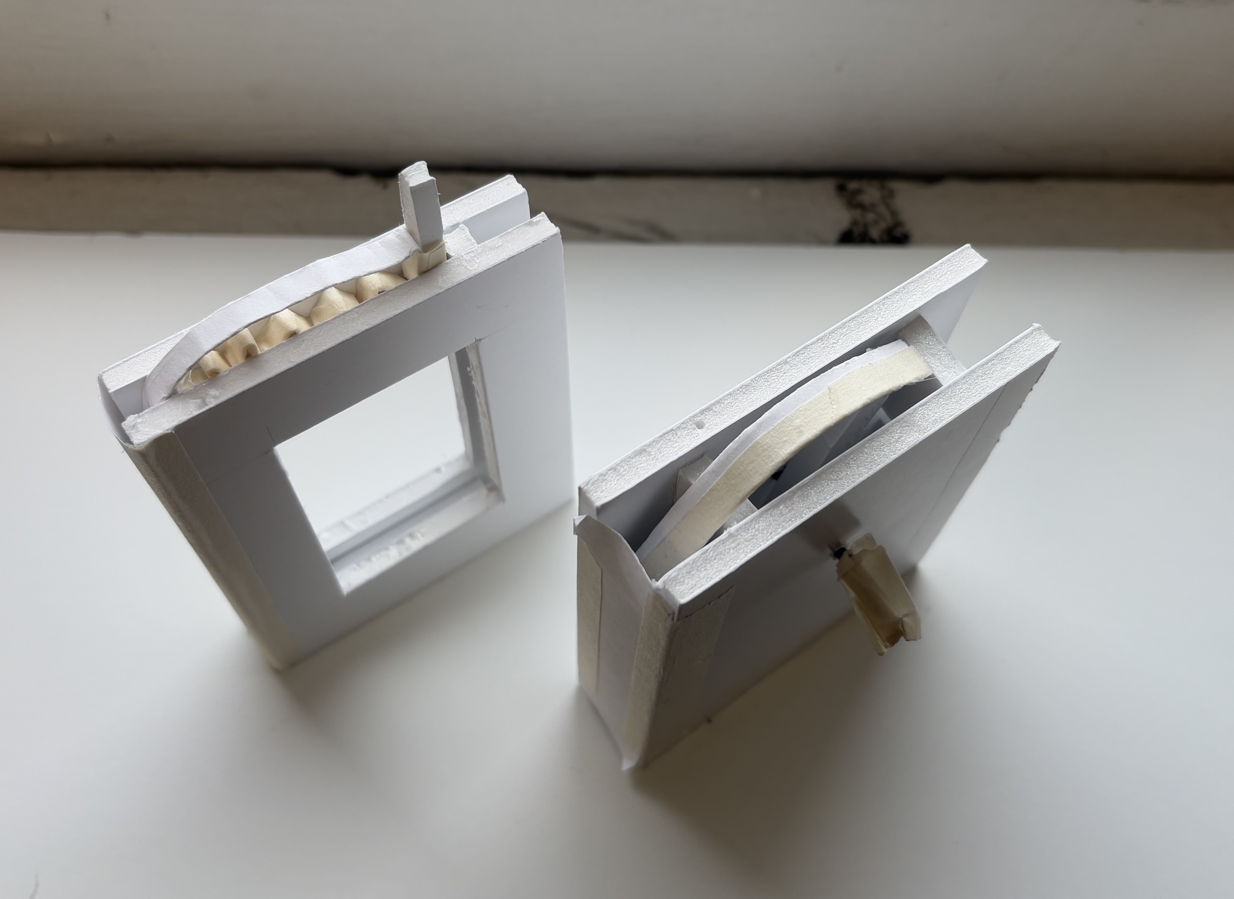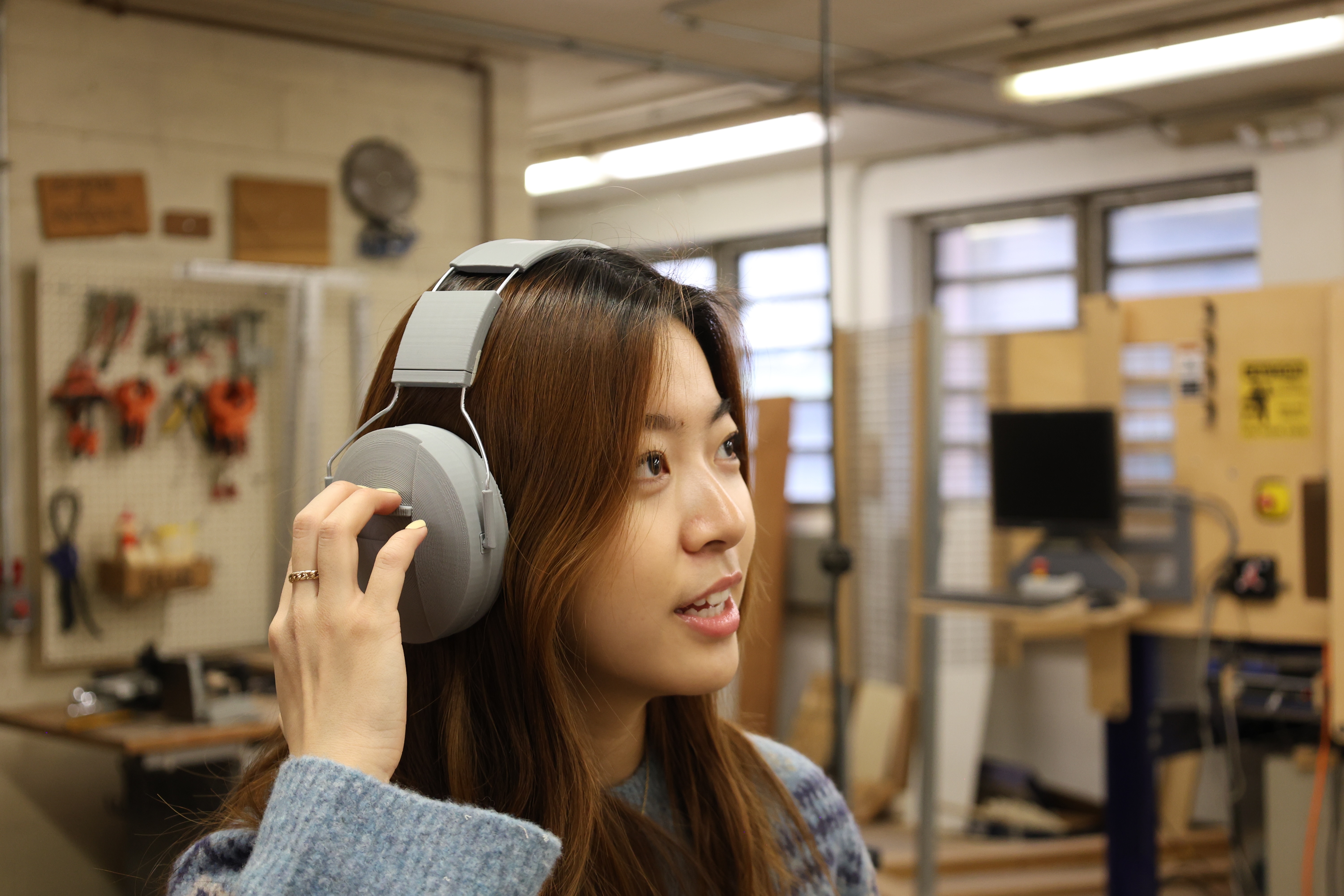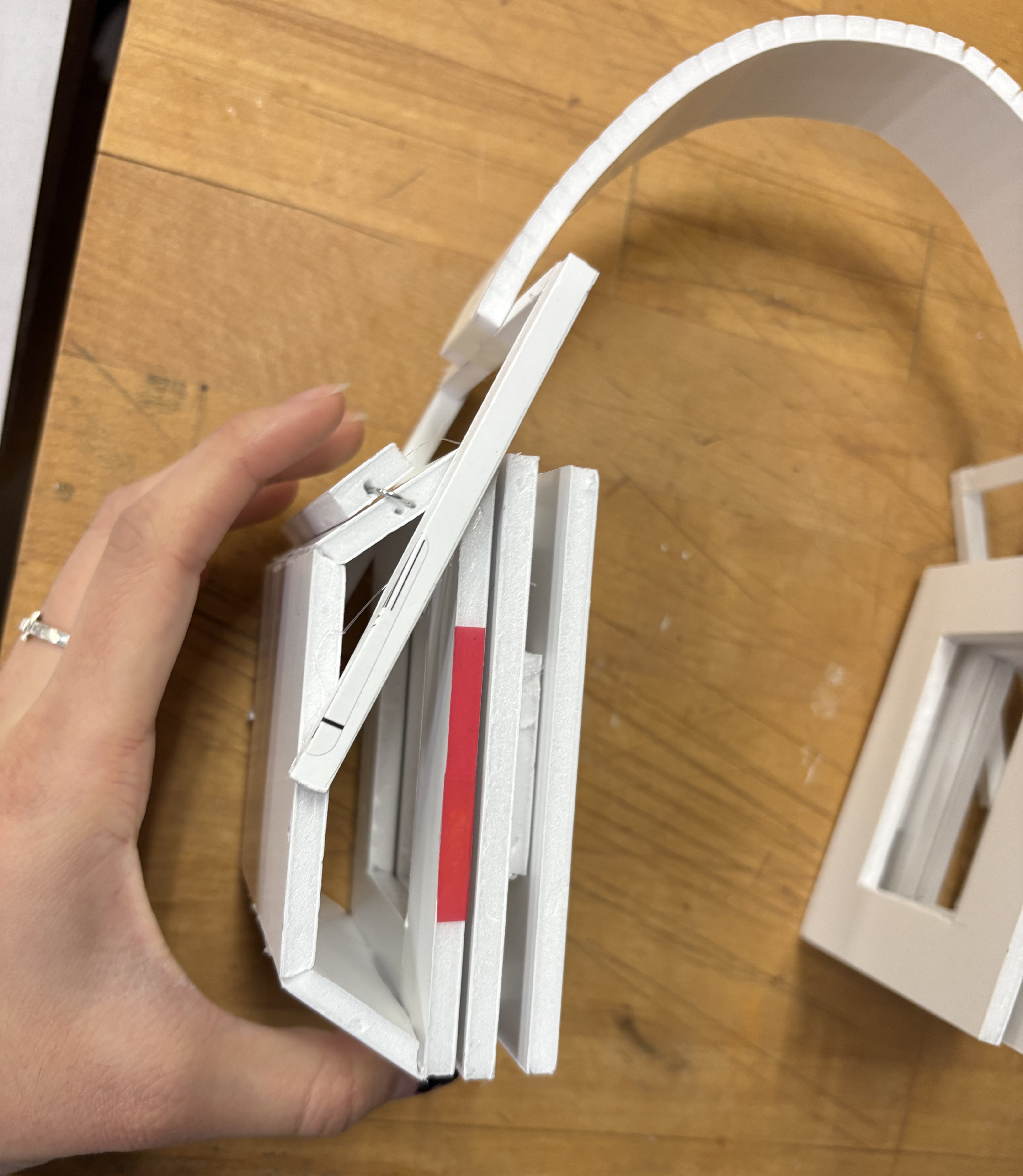 Moved away from electronics to an analogue approach. A door that opens and closes when needing to hear something in the shop or to speak to someone. Band comfort, pivots, how to compress foam inside earmuff when open.