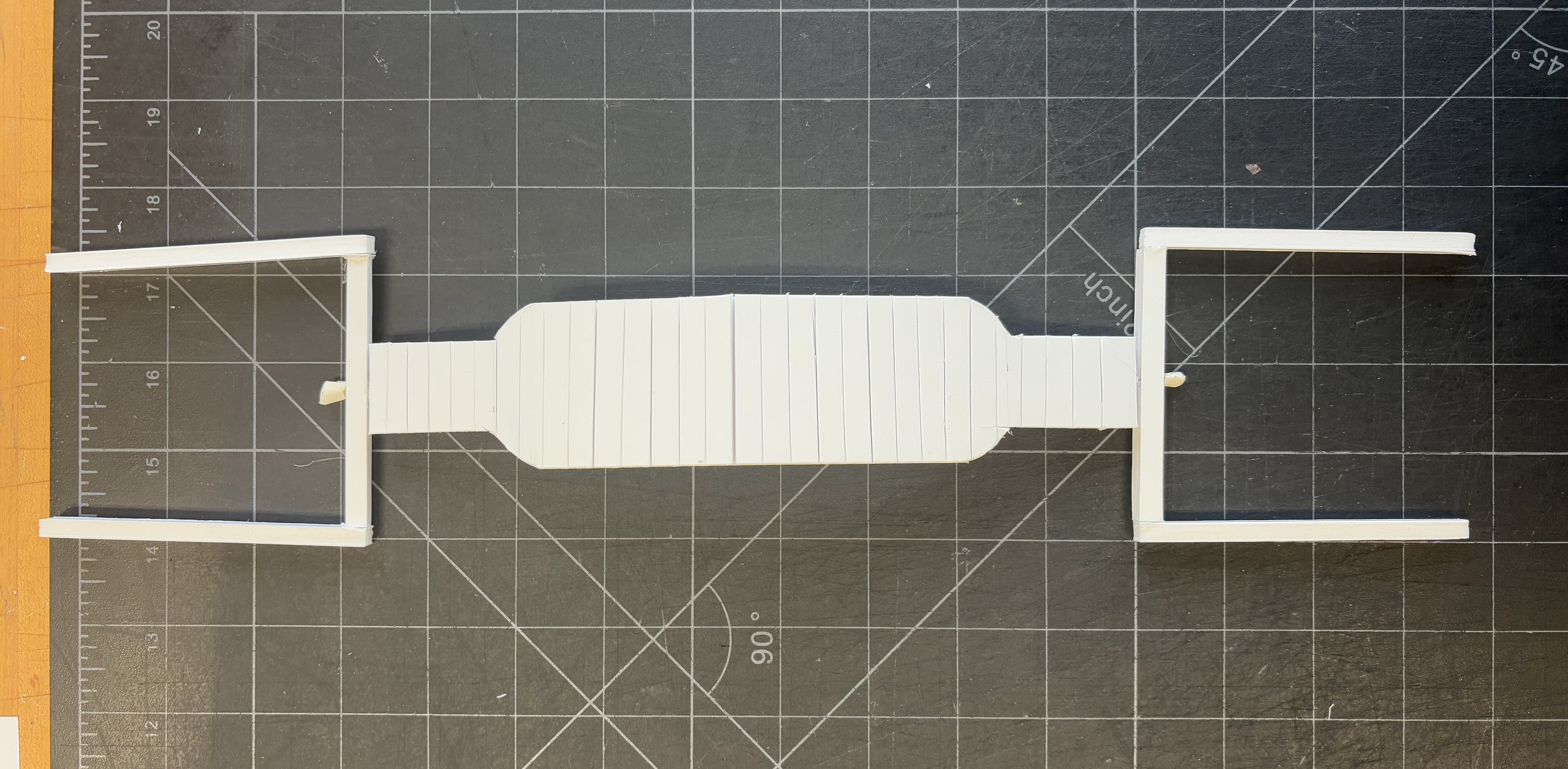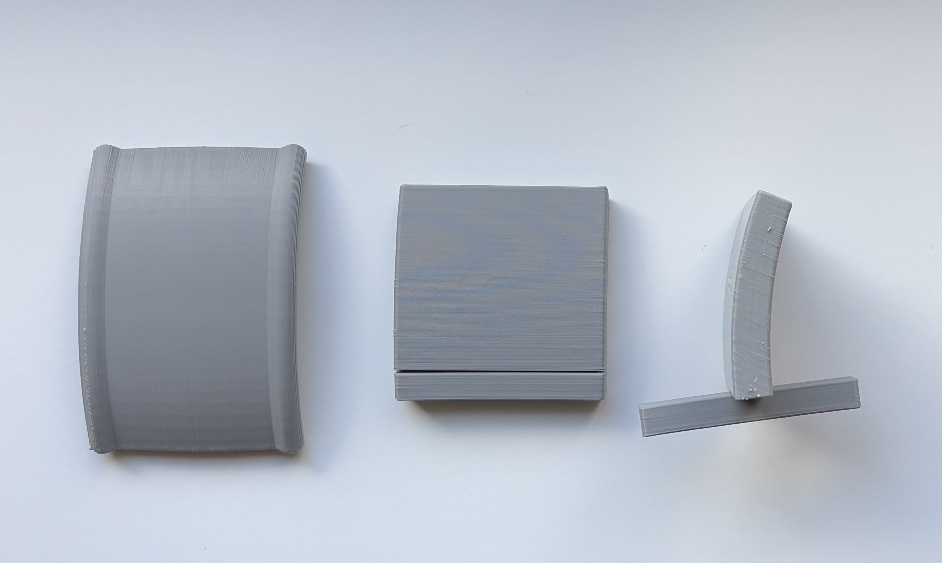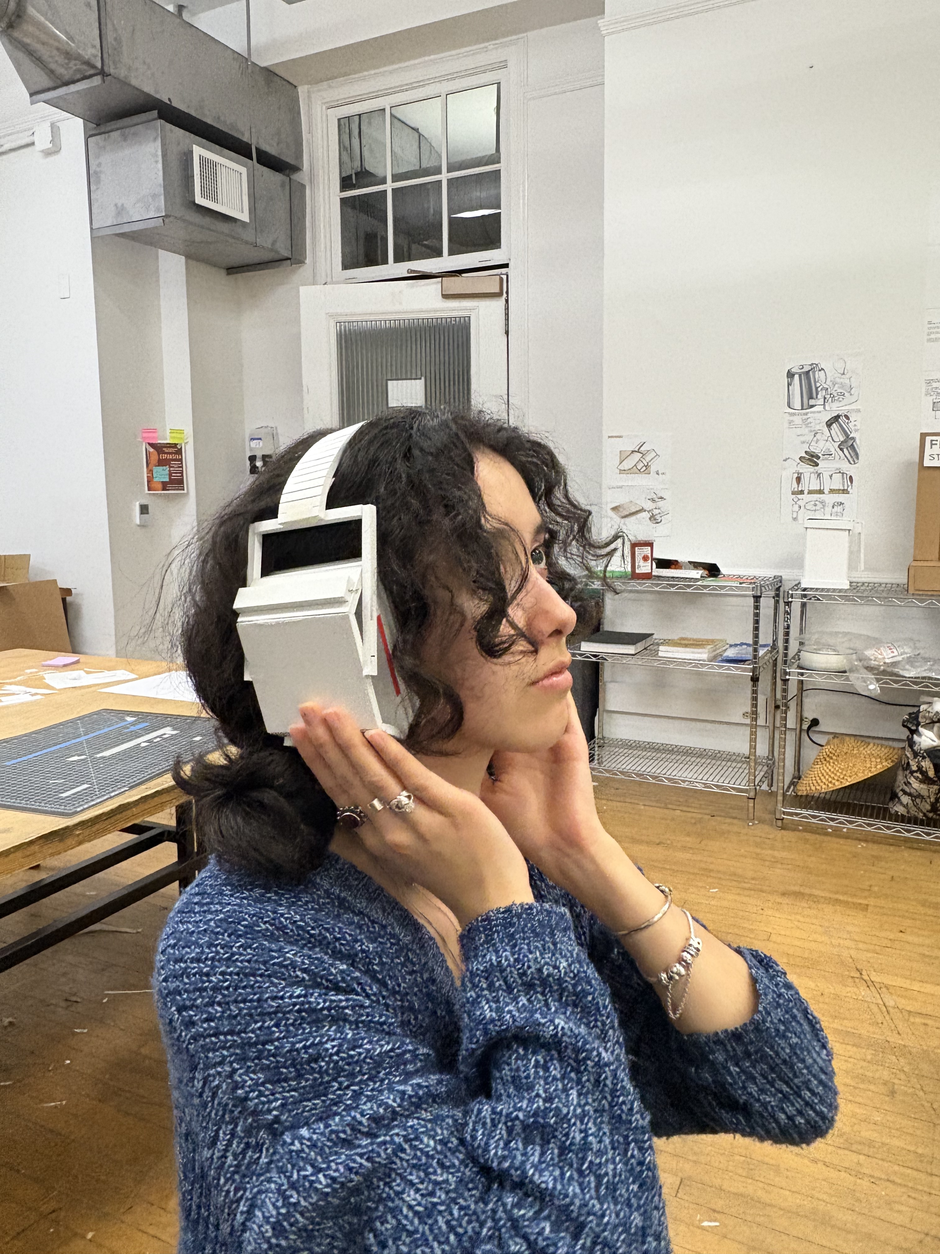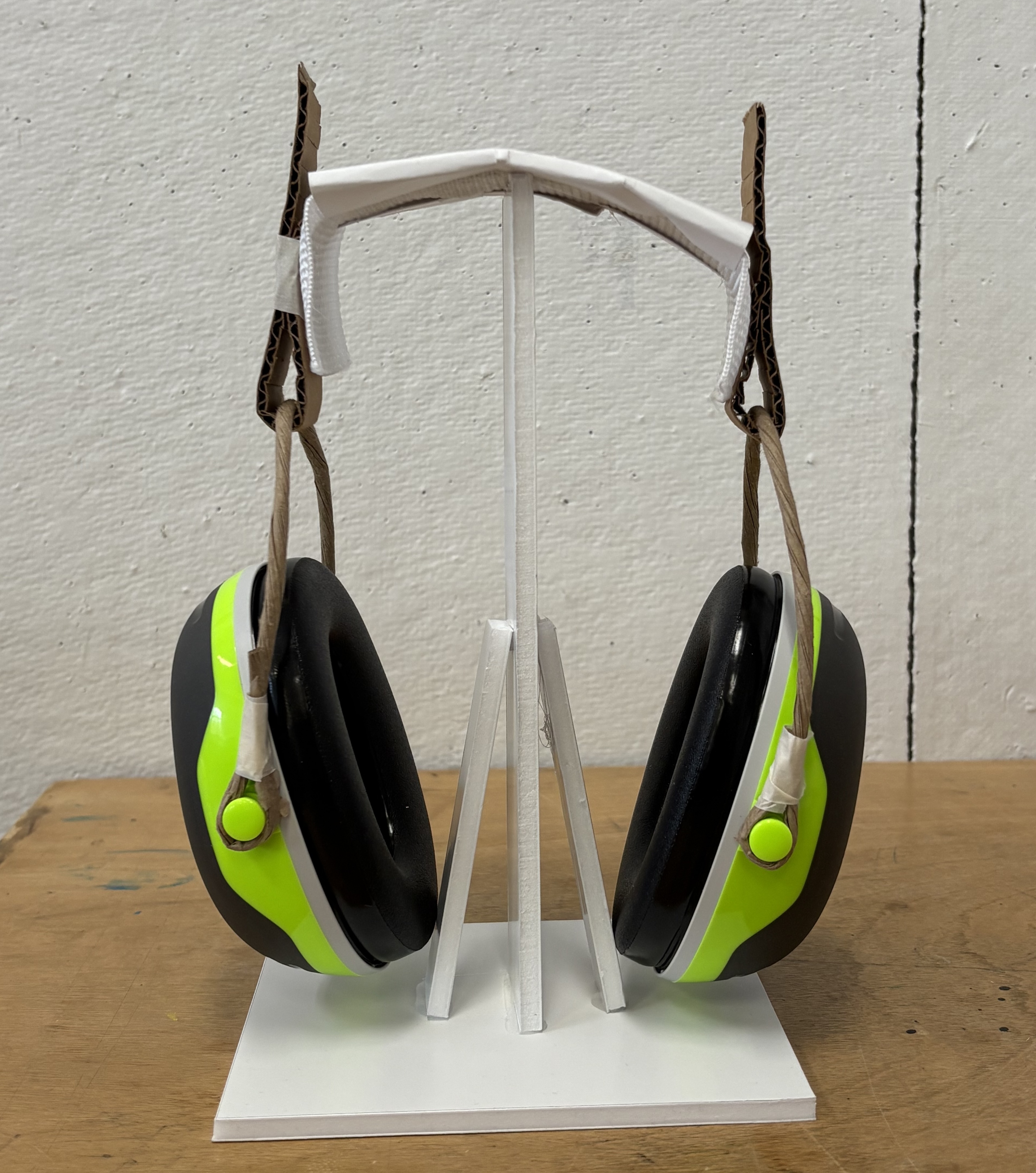 3D printed band and muffs connected with bent wire. Wire architecture borrowed from 3M's visual brand language. Foam pads inside. Wooden kebob stick used as a pivot point.
