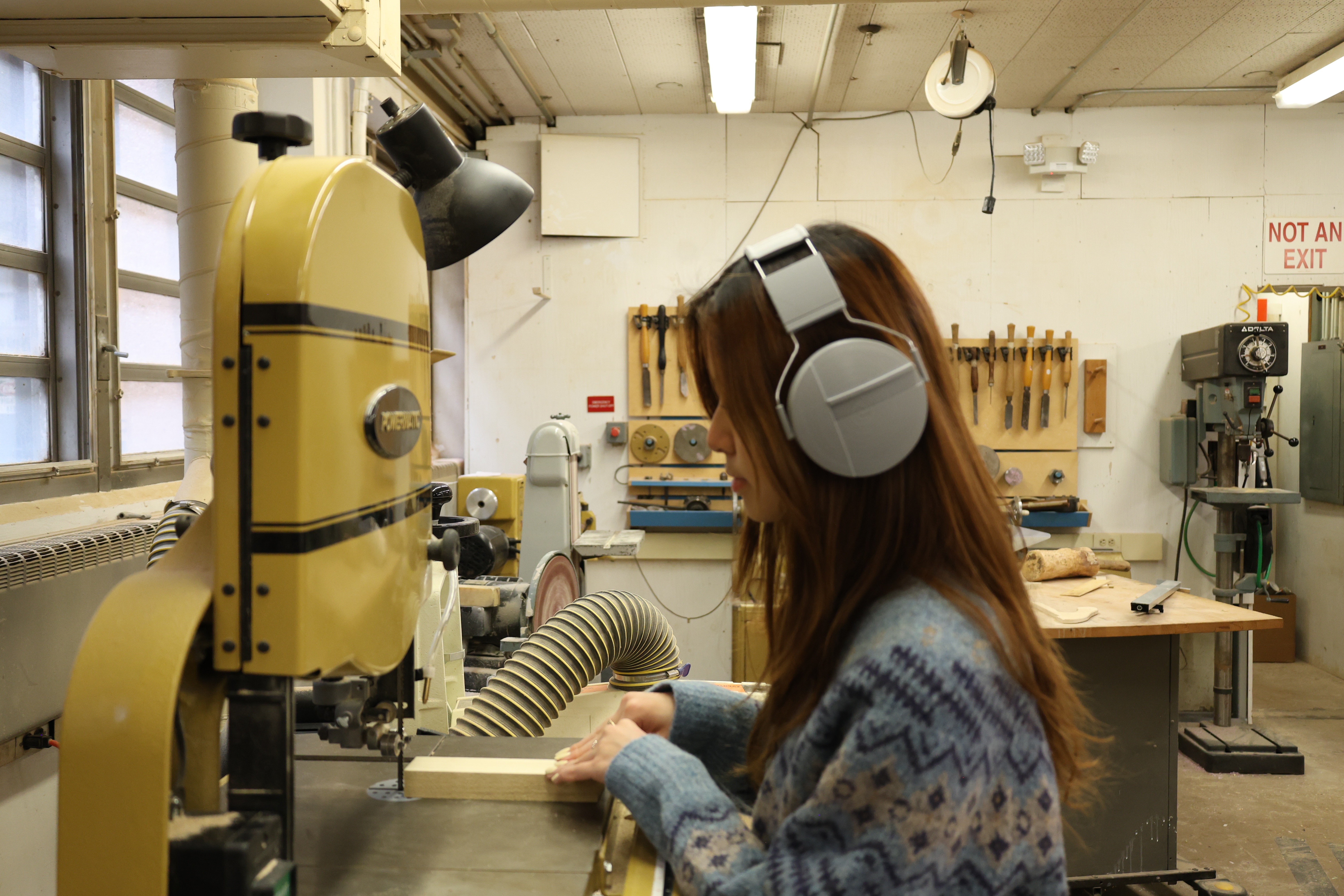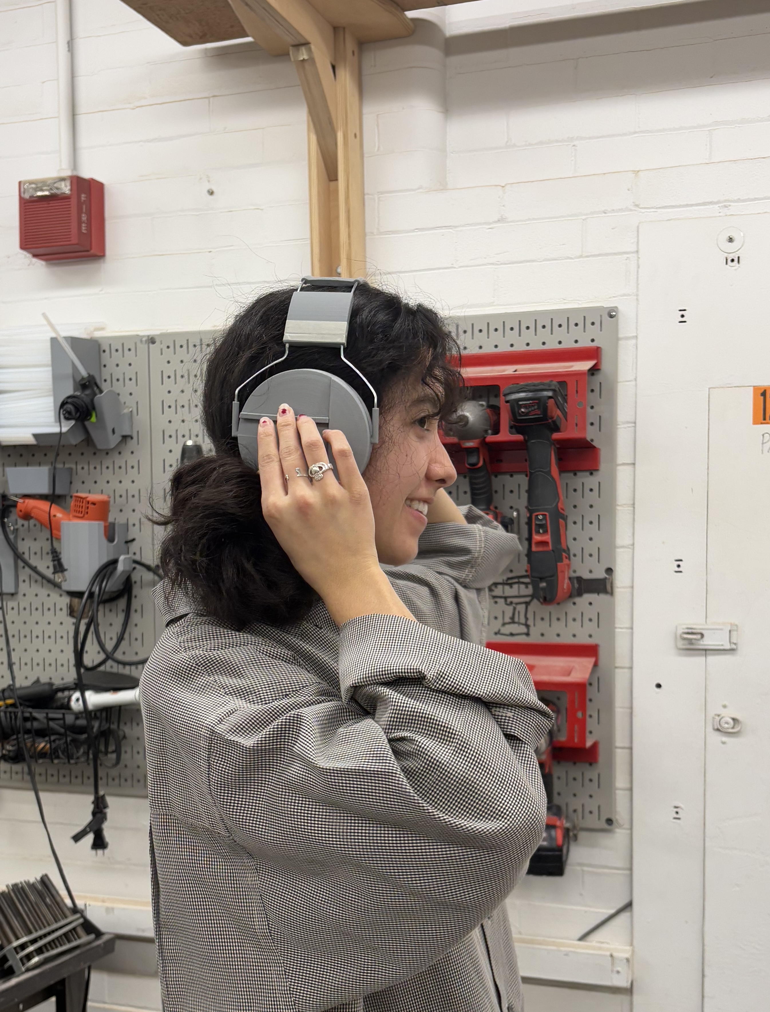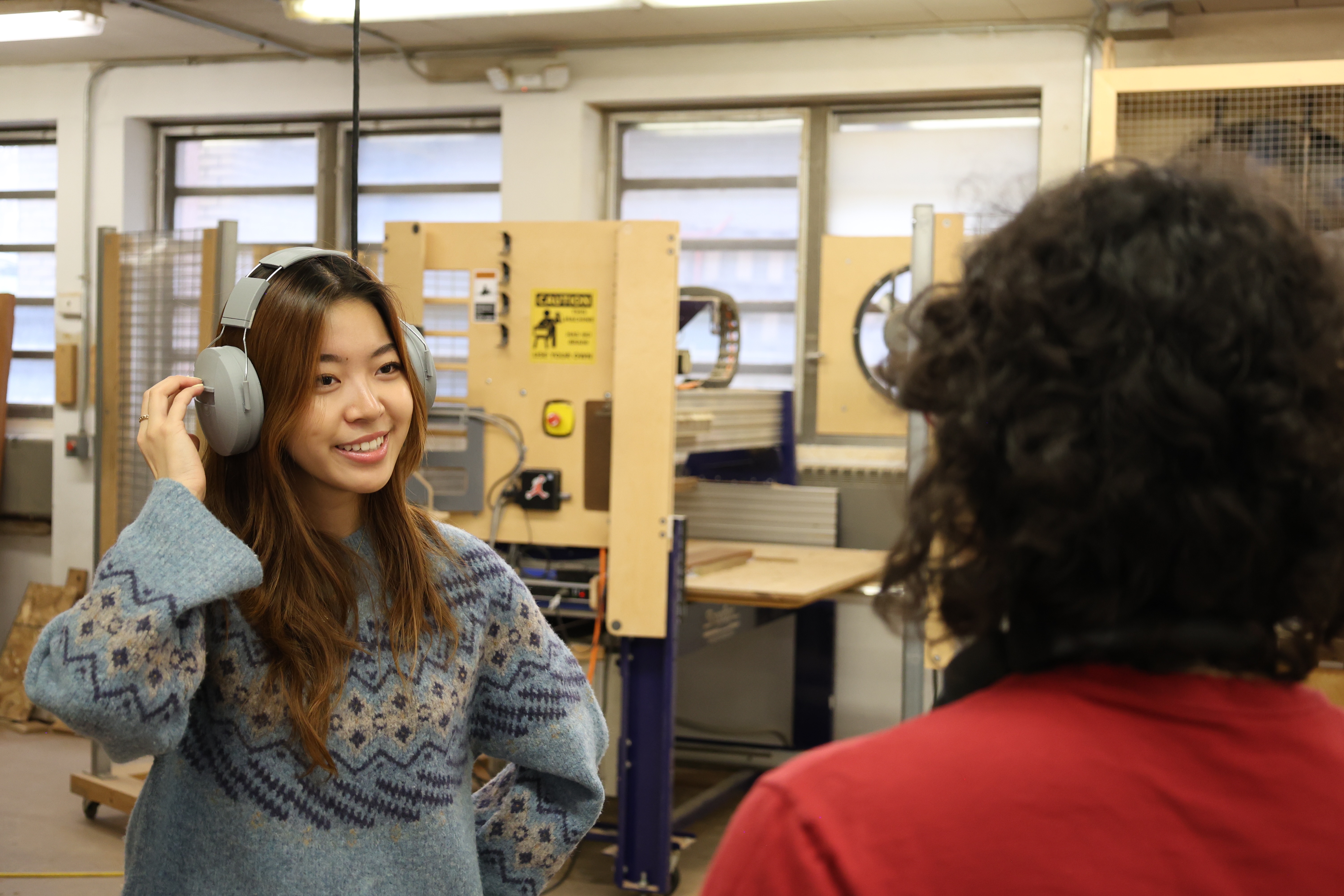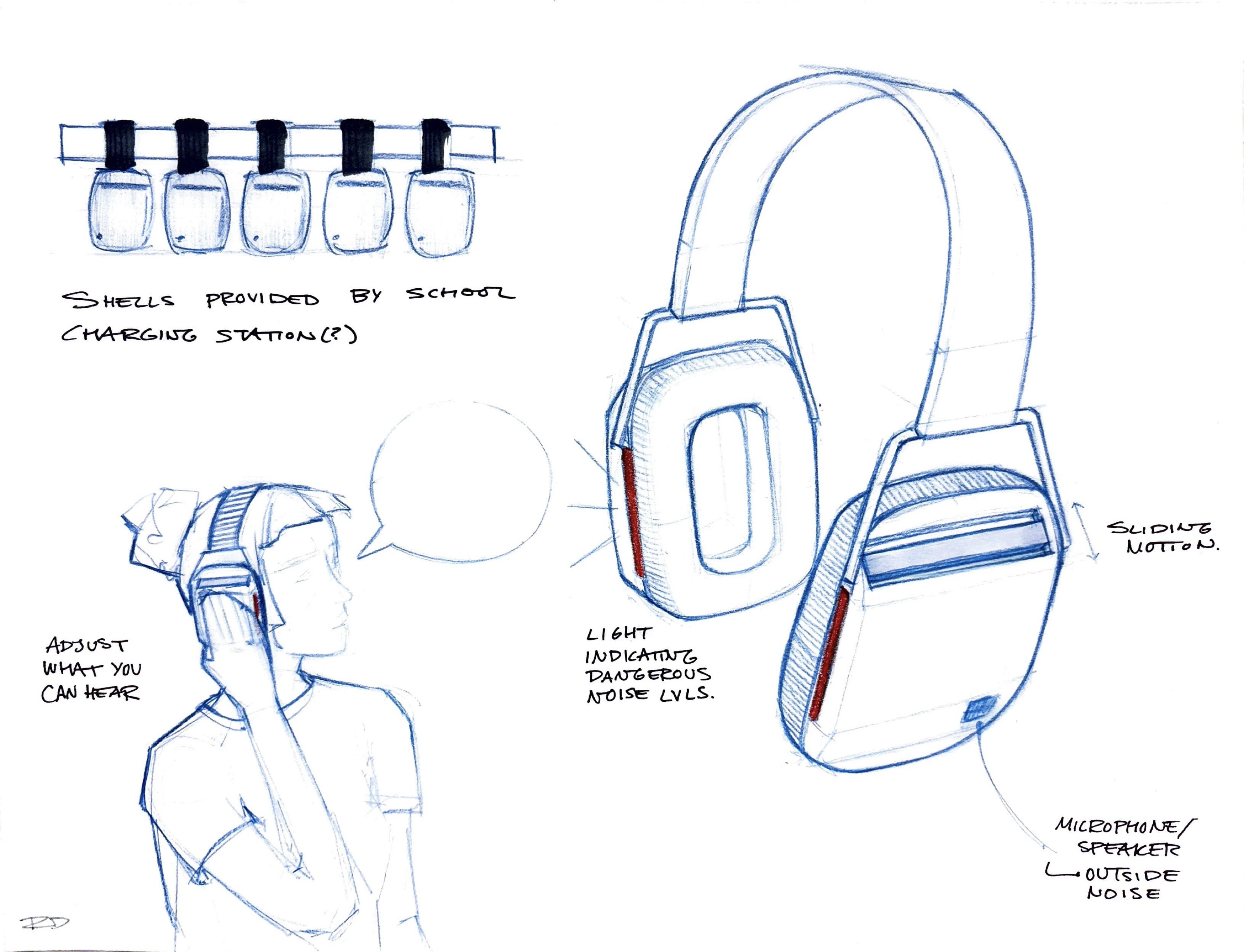 Hearing protection for school machine shops, supporting discussion and shared experience. A handle on the face of the muff pulls down to open a gap that lets in noise.