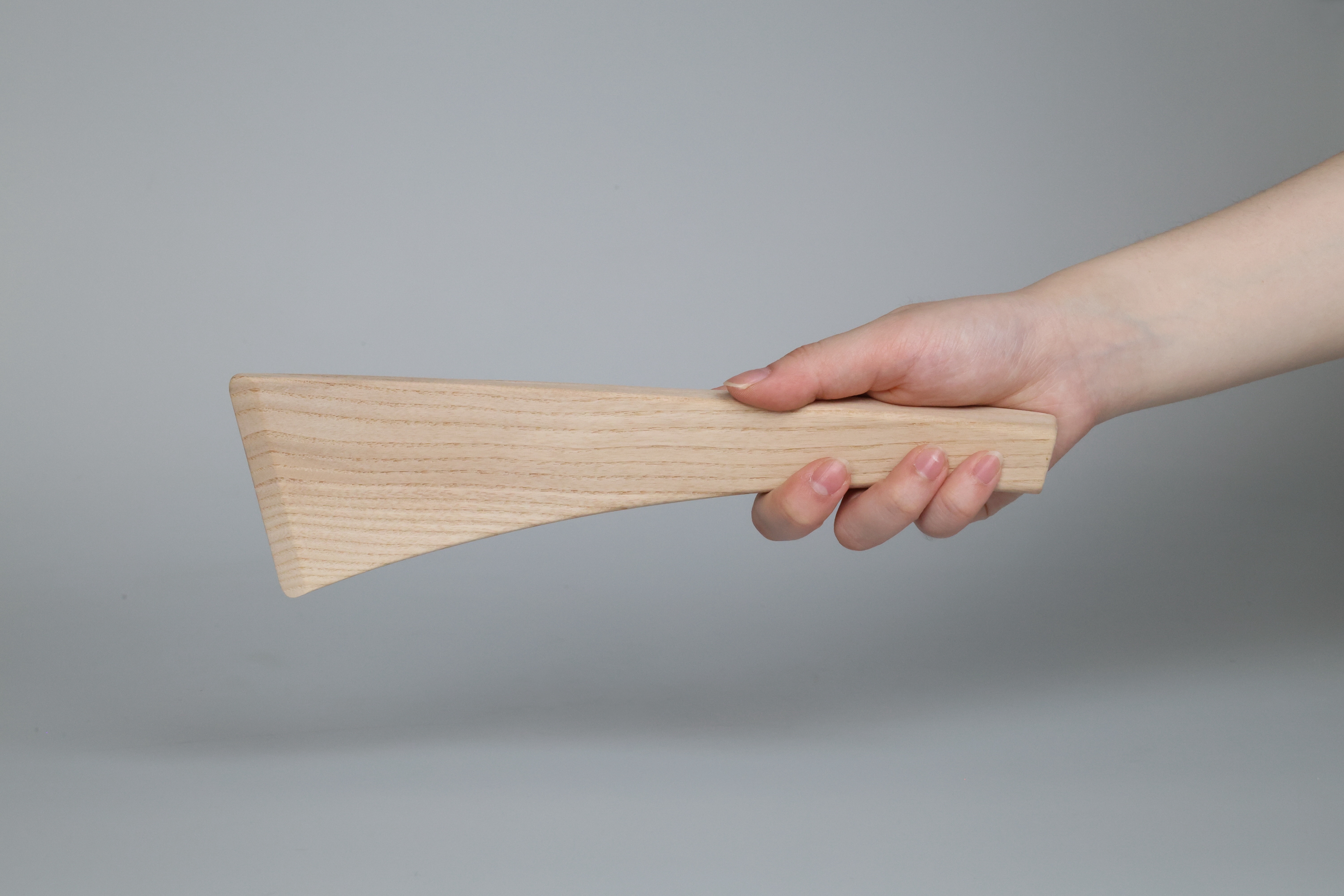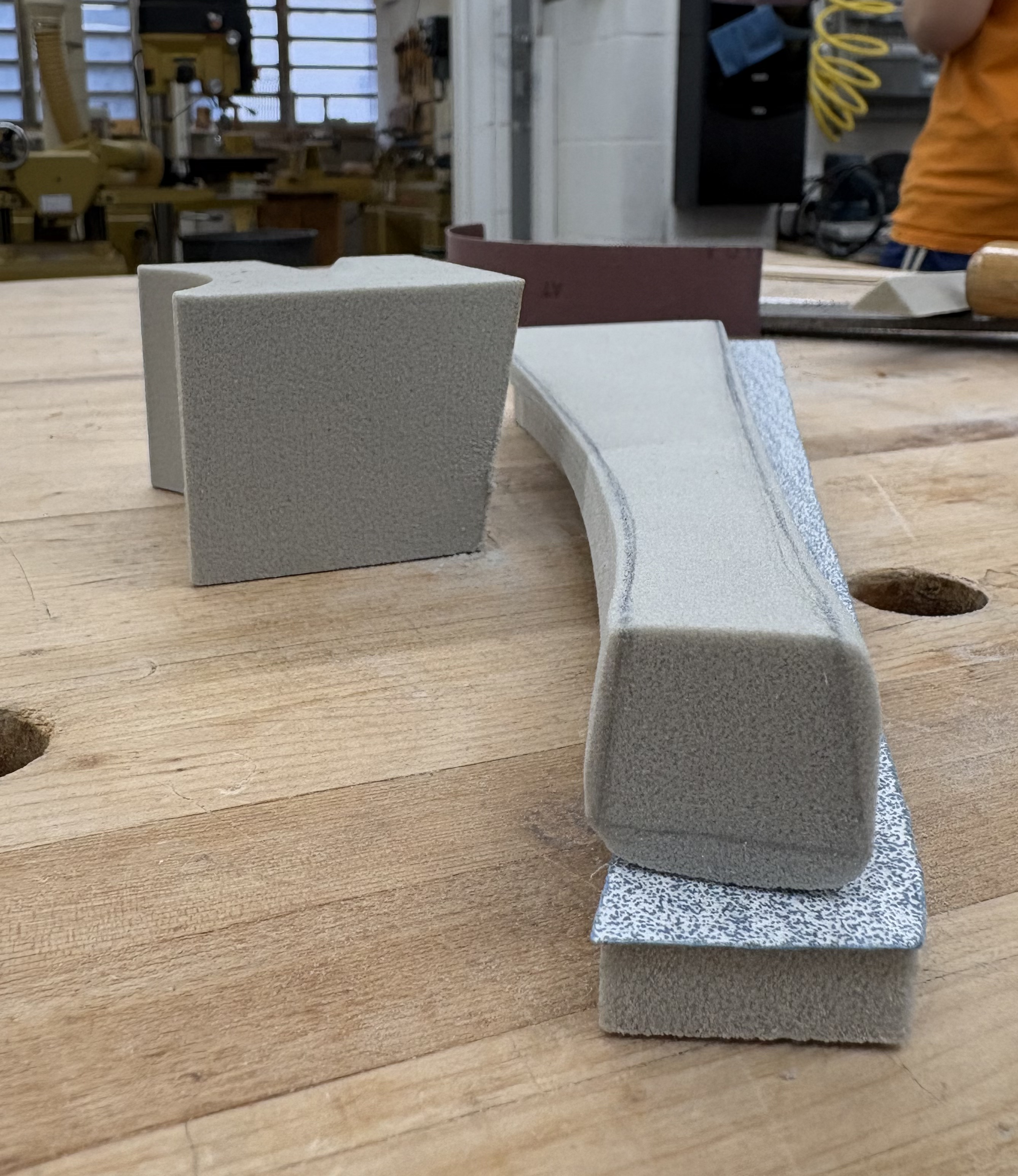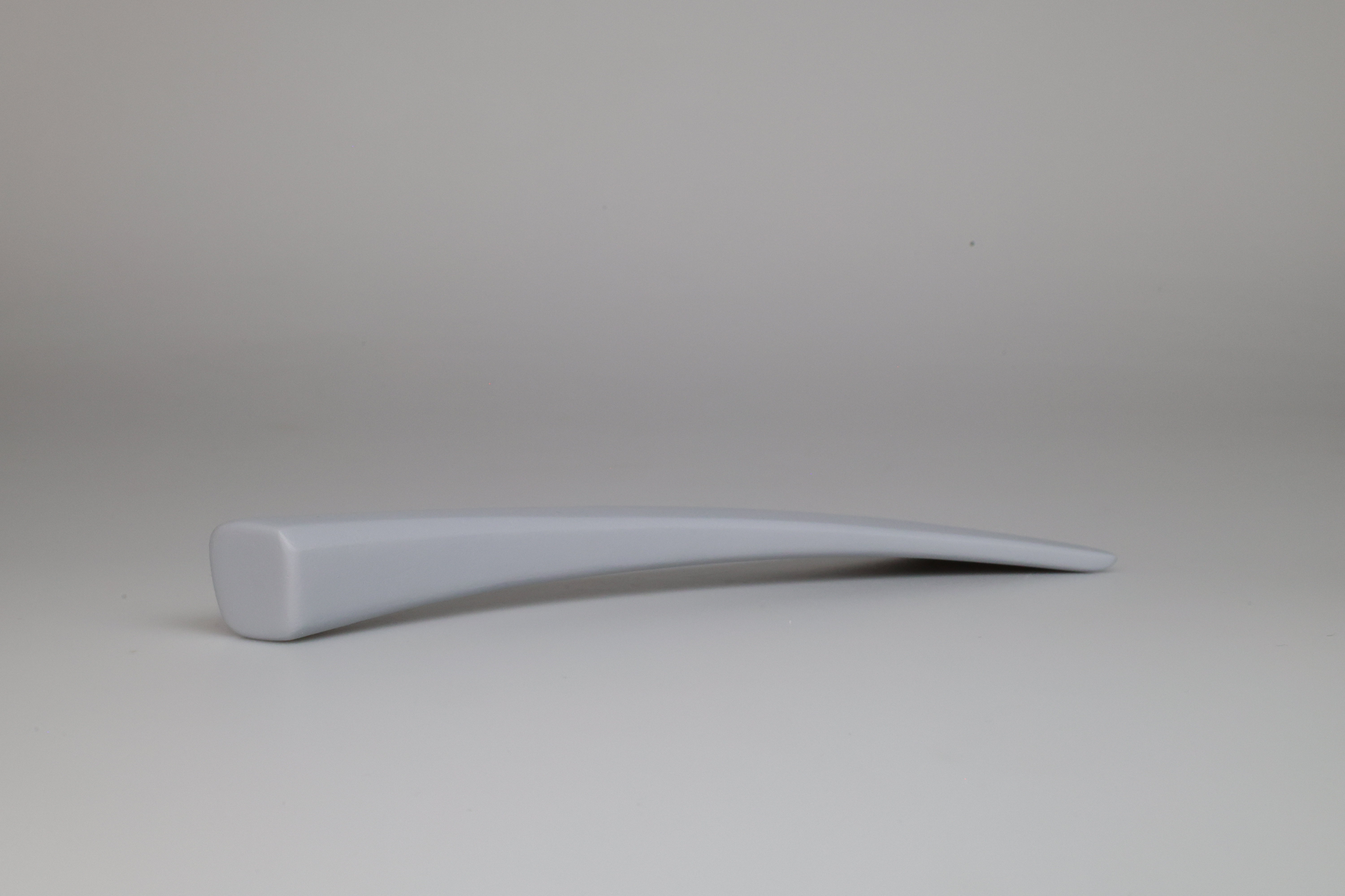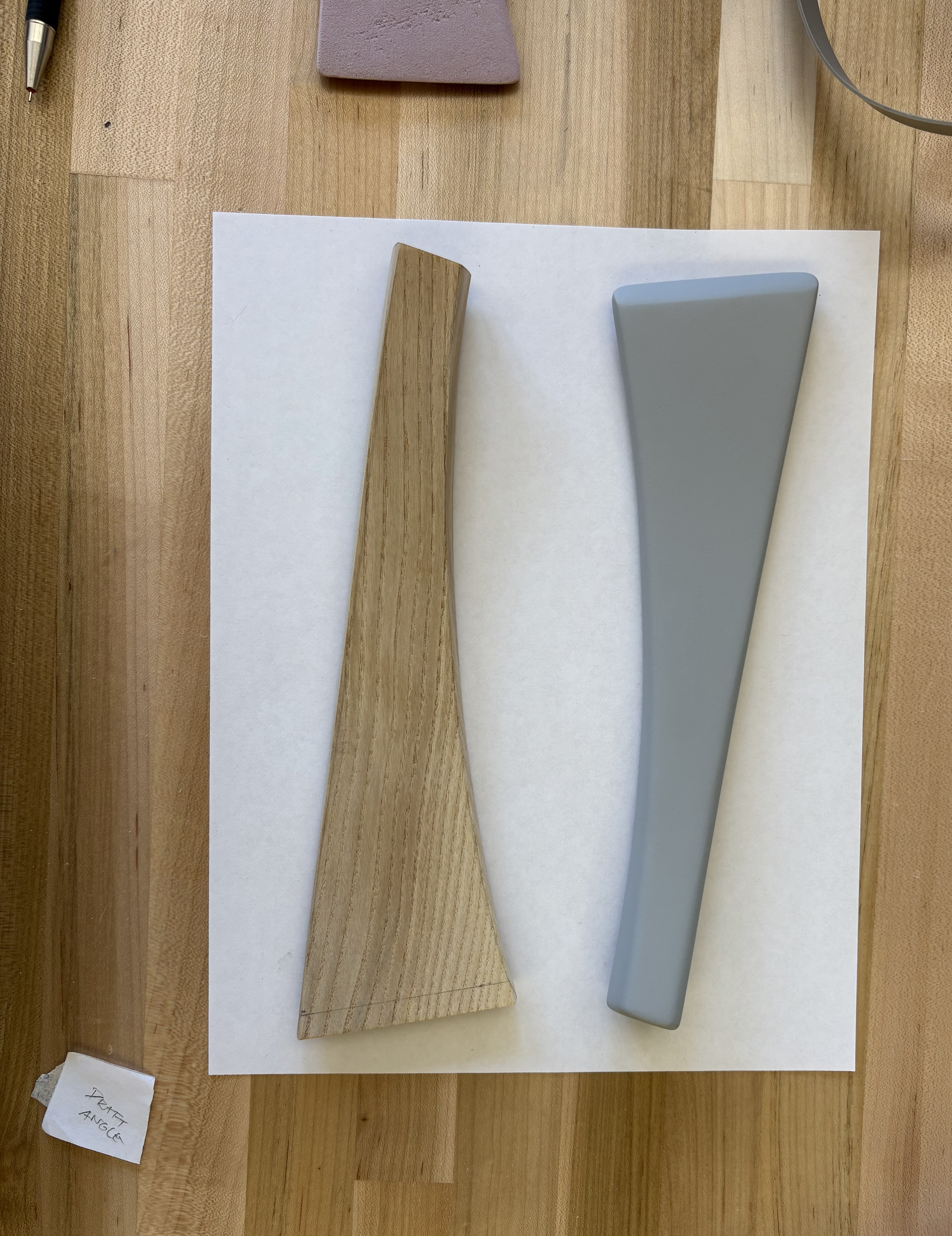 Two pink foam and one grey foam model. The first pink foam model confirmed a nice curve for the index finger to rest on top of. Testing comfort and the curves in relation to hand, wrist, and arm. The second pink foam was the refined form, testing chamfer, radius, and transitional blends. The symmetrical handle face was decided on the grey foam, with an additional tapering chamfer on the sides.