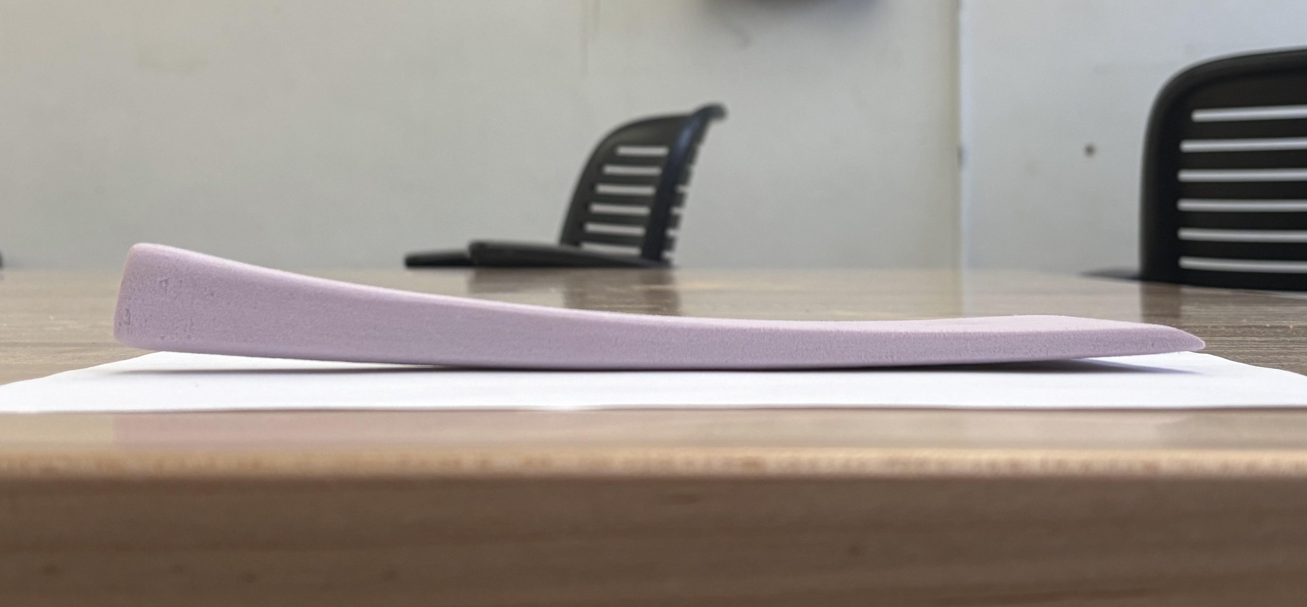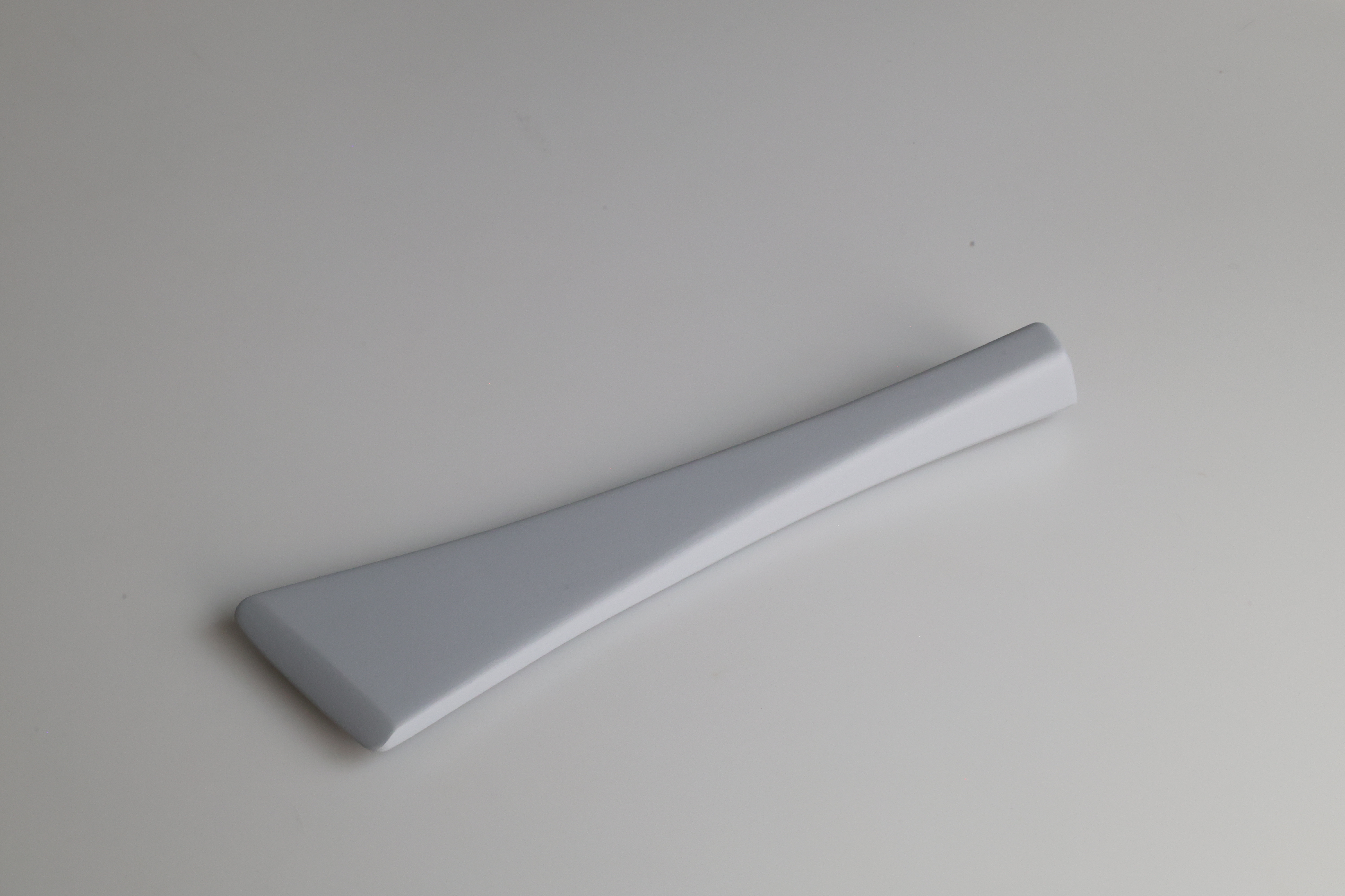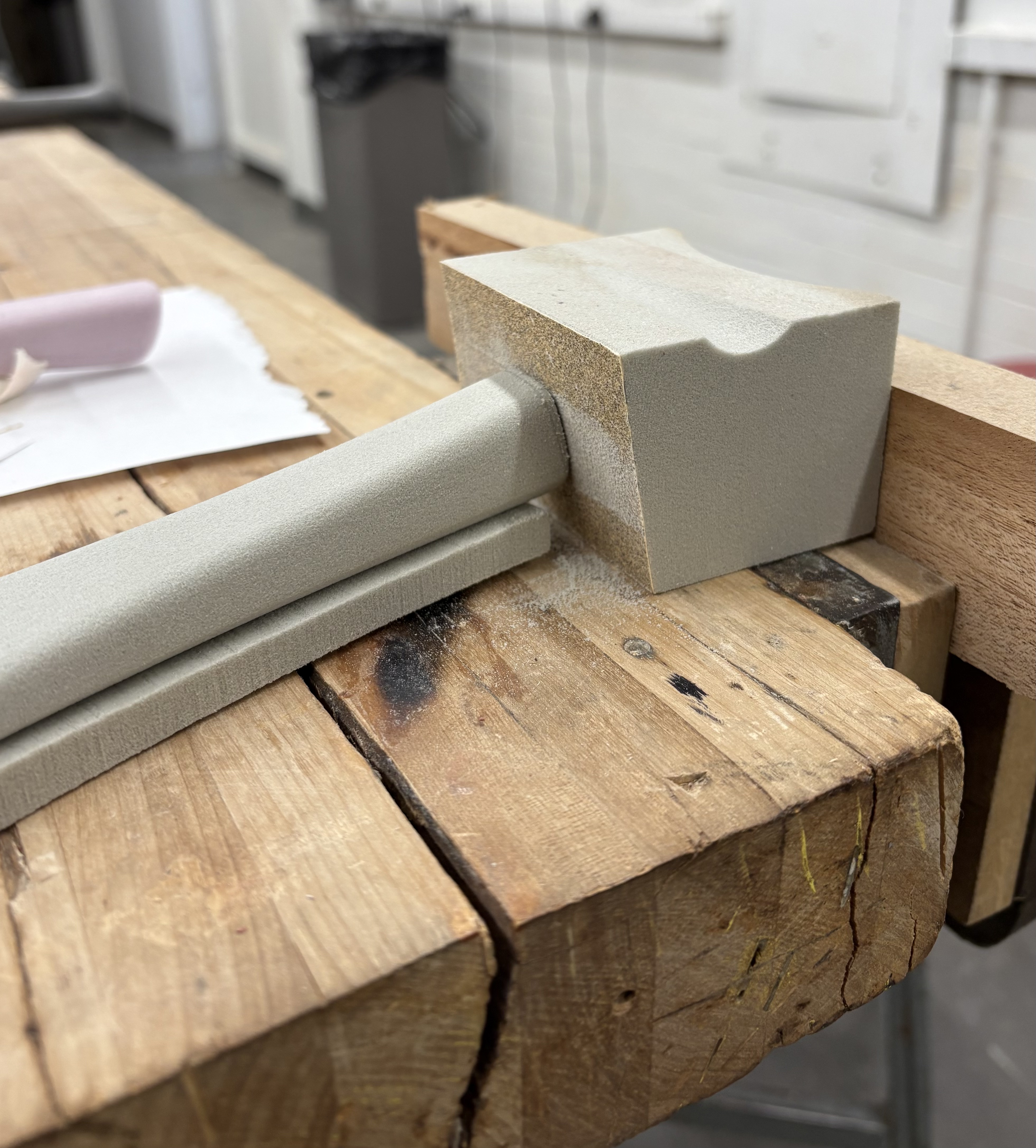 Two pink foam and one grey foam model. The first pink foam model confirmed a nice curve for the index finger to rest on top of. Testing comfort and the curves in relation to hand, wrist, and arm. The second pink foam was the refined form, testing chamfer, radius, and transitional blends. The symmetrical handle face was decided on the grey foam, with an additional tapering chamfer on the sides.