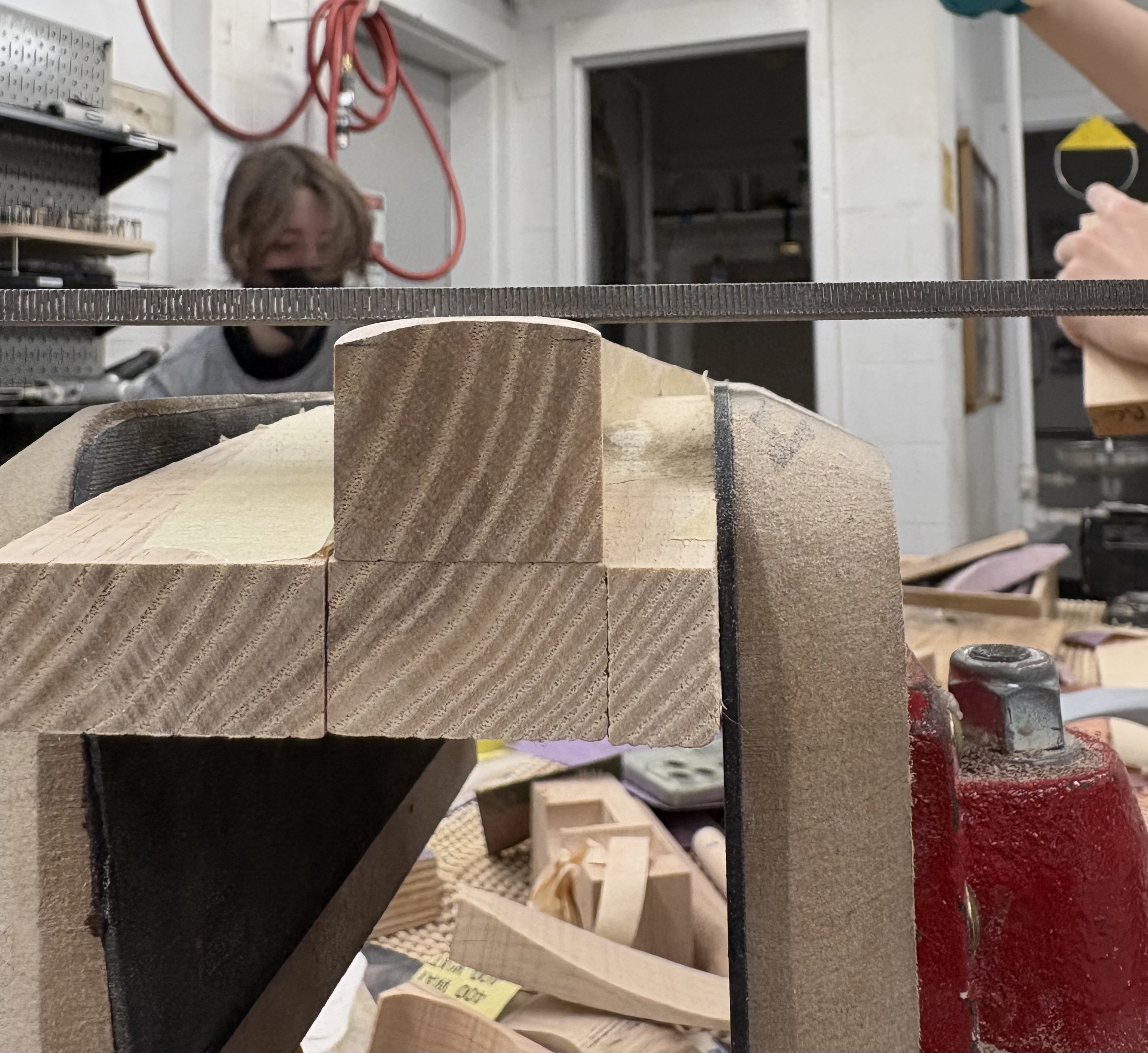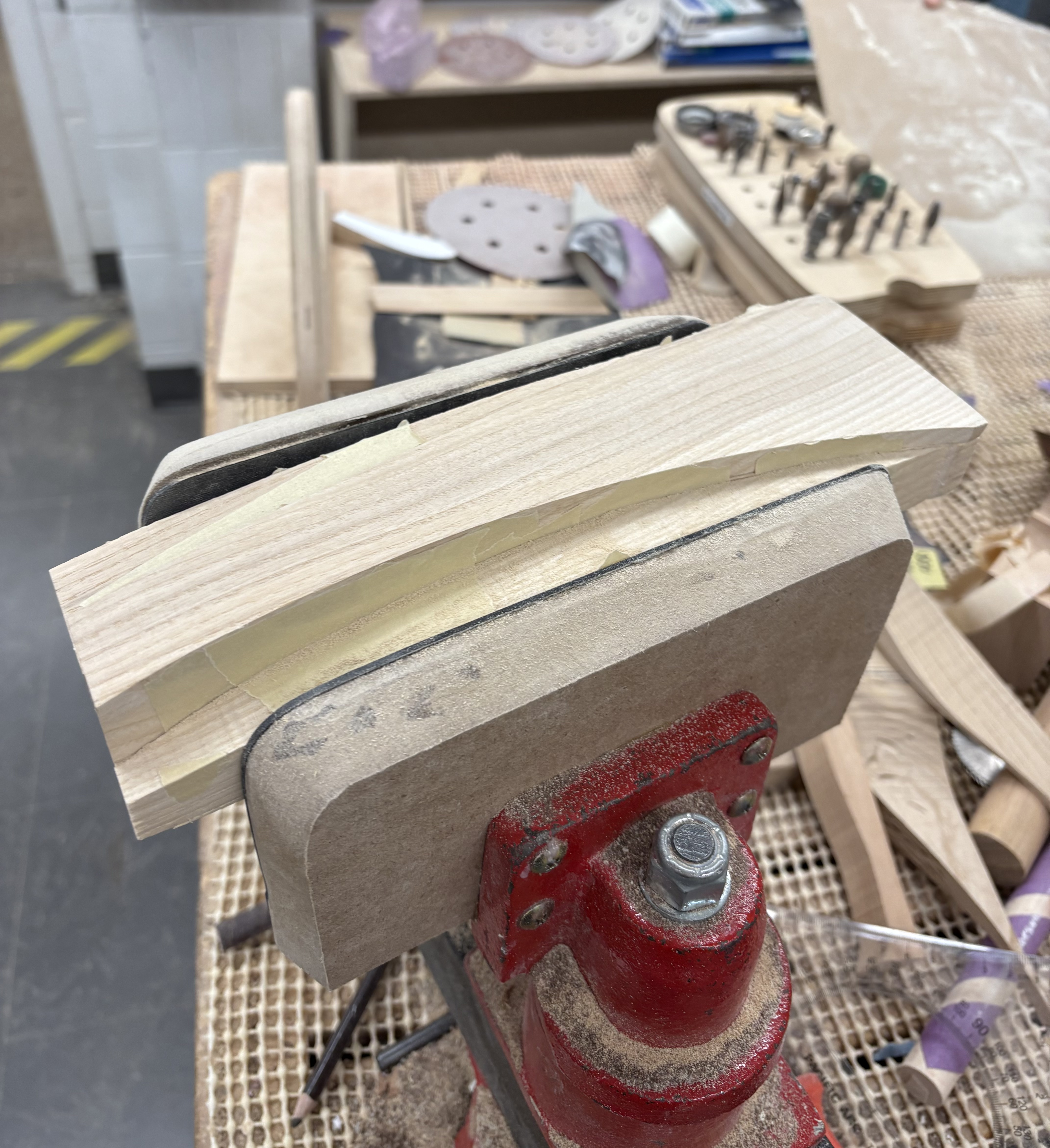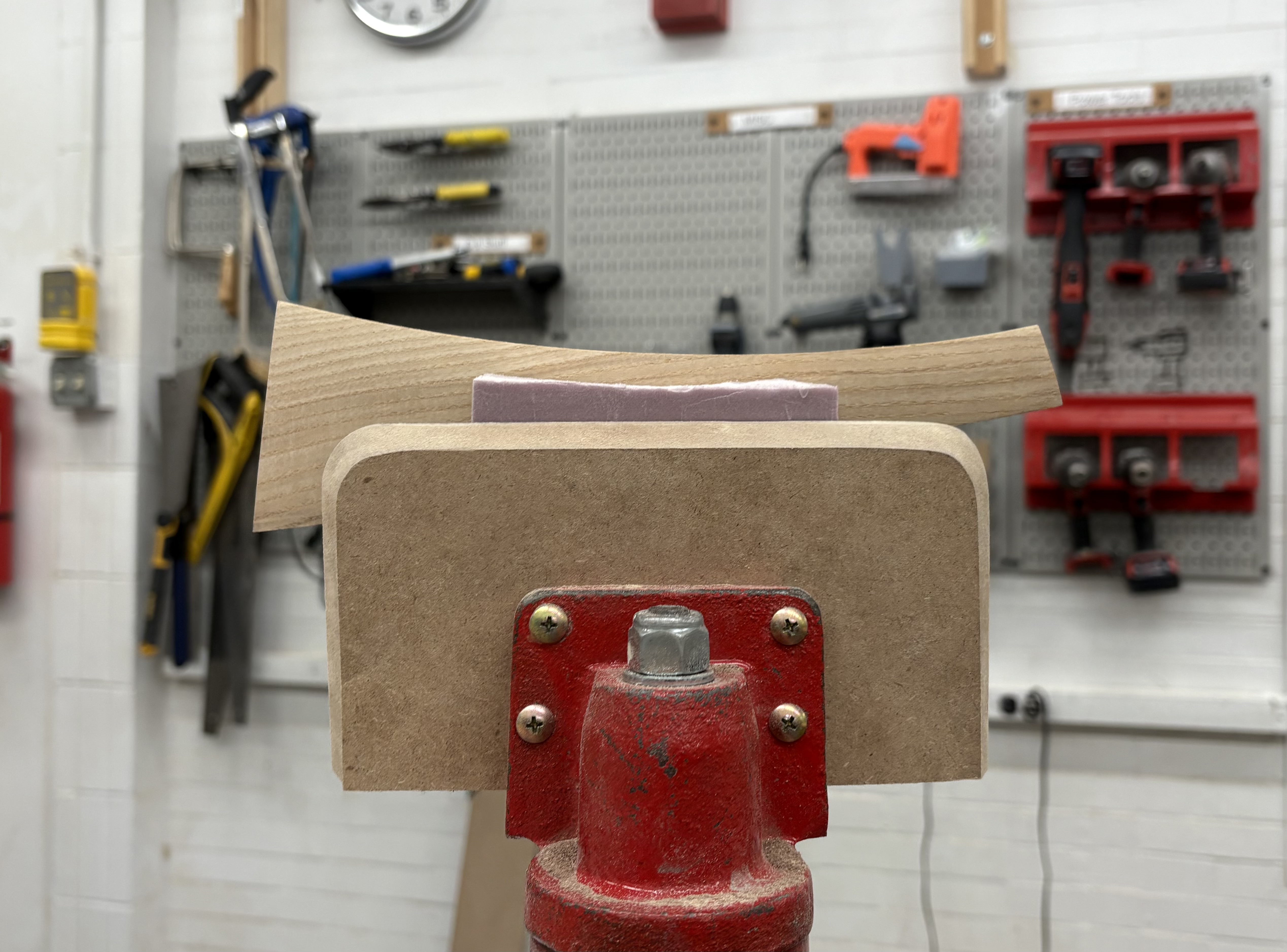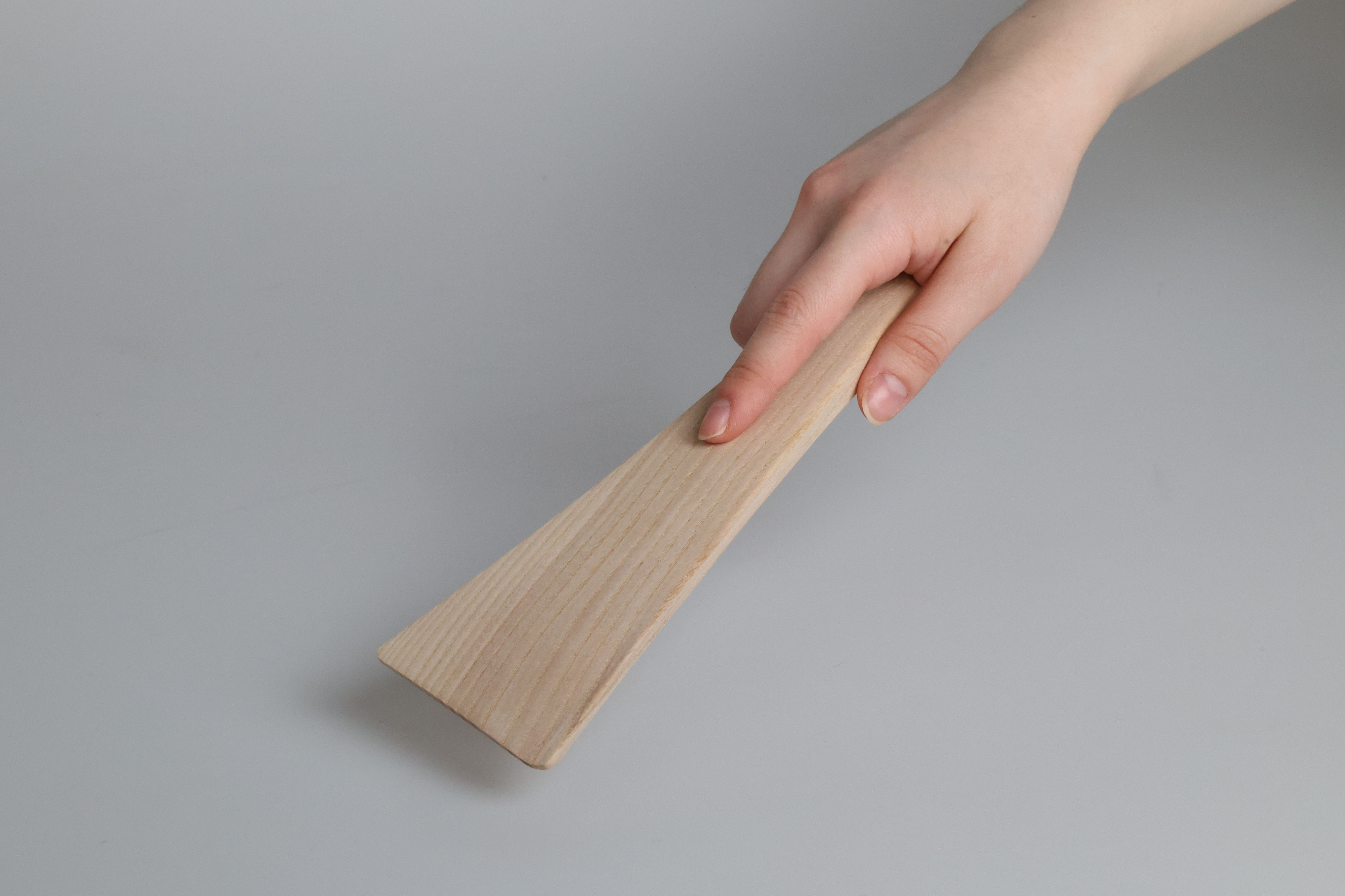 Two pink foam and one grey foam model. The first pink foam model confirmed a nice curve for the index finger to rest on top of. Testing comfort and the curves in relation to hand, wrist, and arm. The second pink foam was the refined form, testing chamfer, radius, and transitional blends. The symmetrical handle face was decided on the grey foam, with an additional tapering chamfer on the sides.